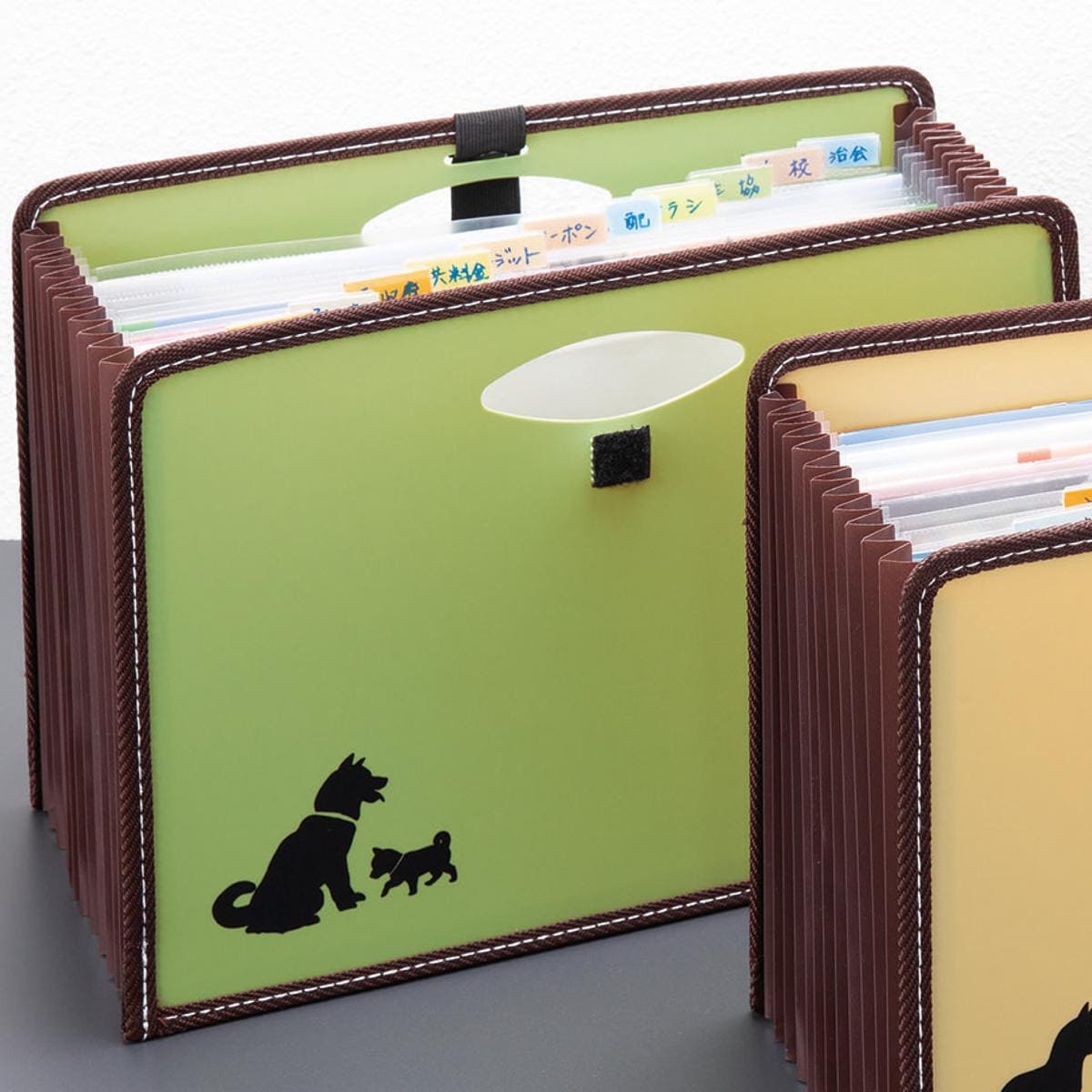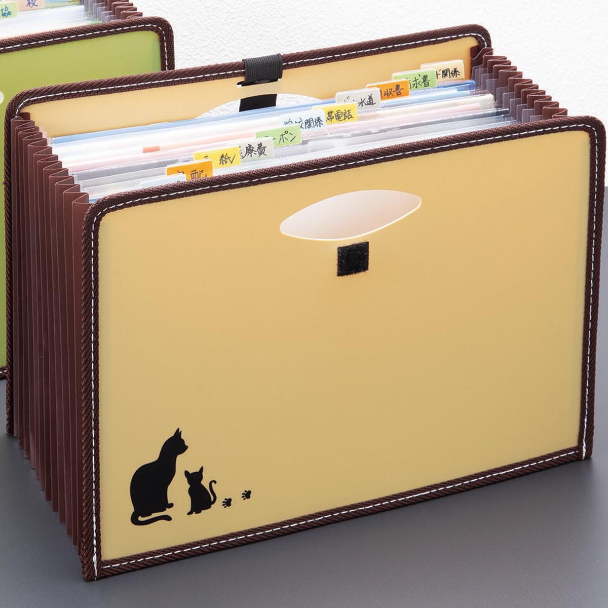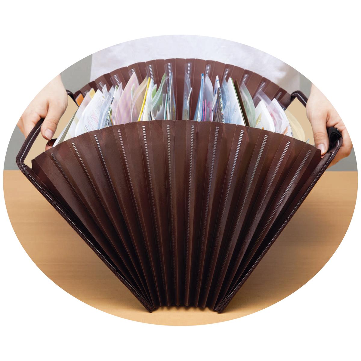 A4サイズがすっぽり! 収納量に合わせて伸縮自在。仕分けに便利な13のポケットは月ごとの書類の整理にも活躍。収納時はベルトで留めてコンパクトに。