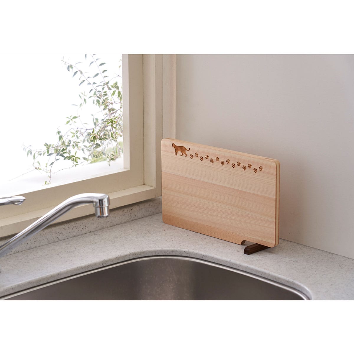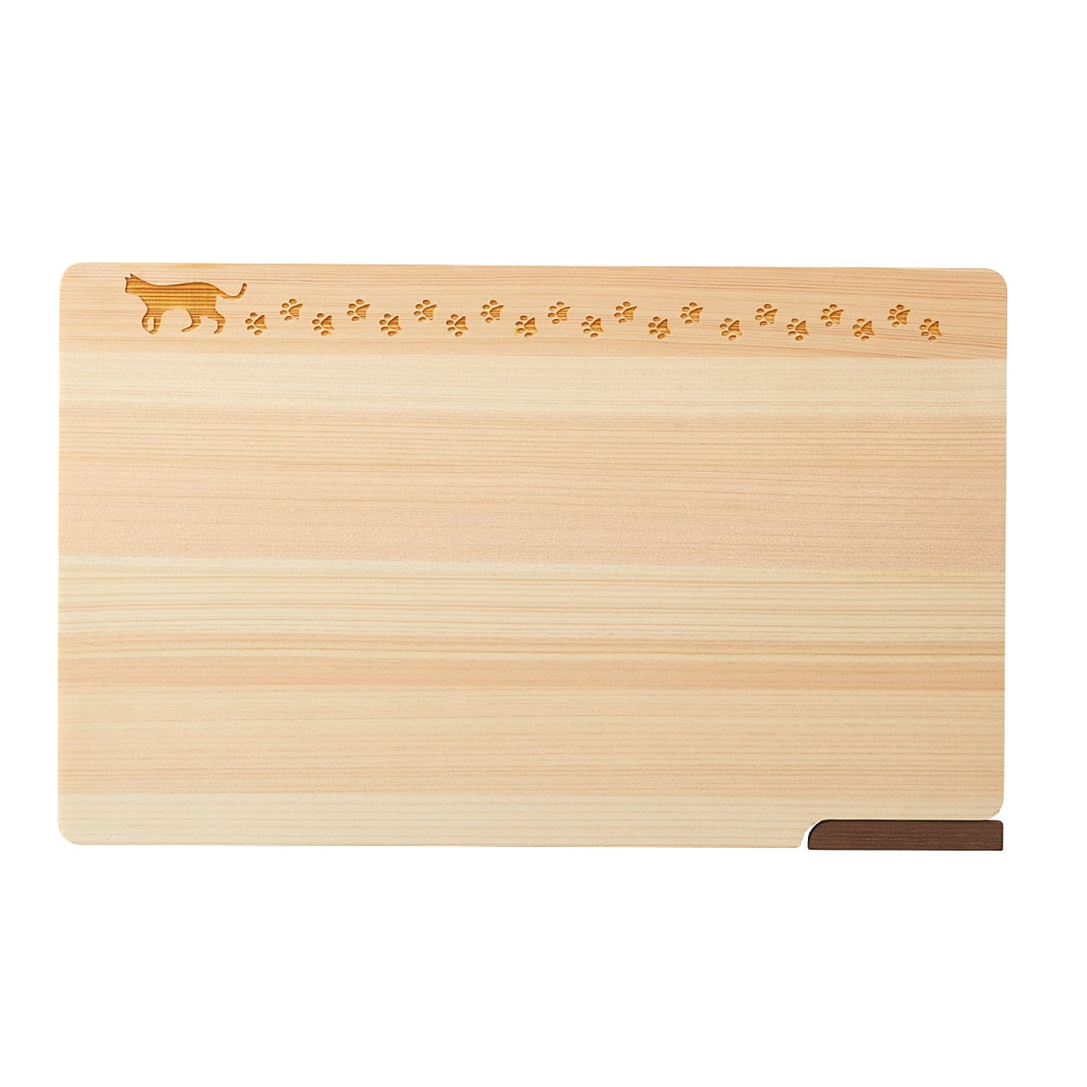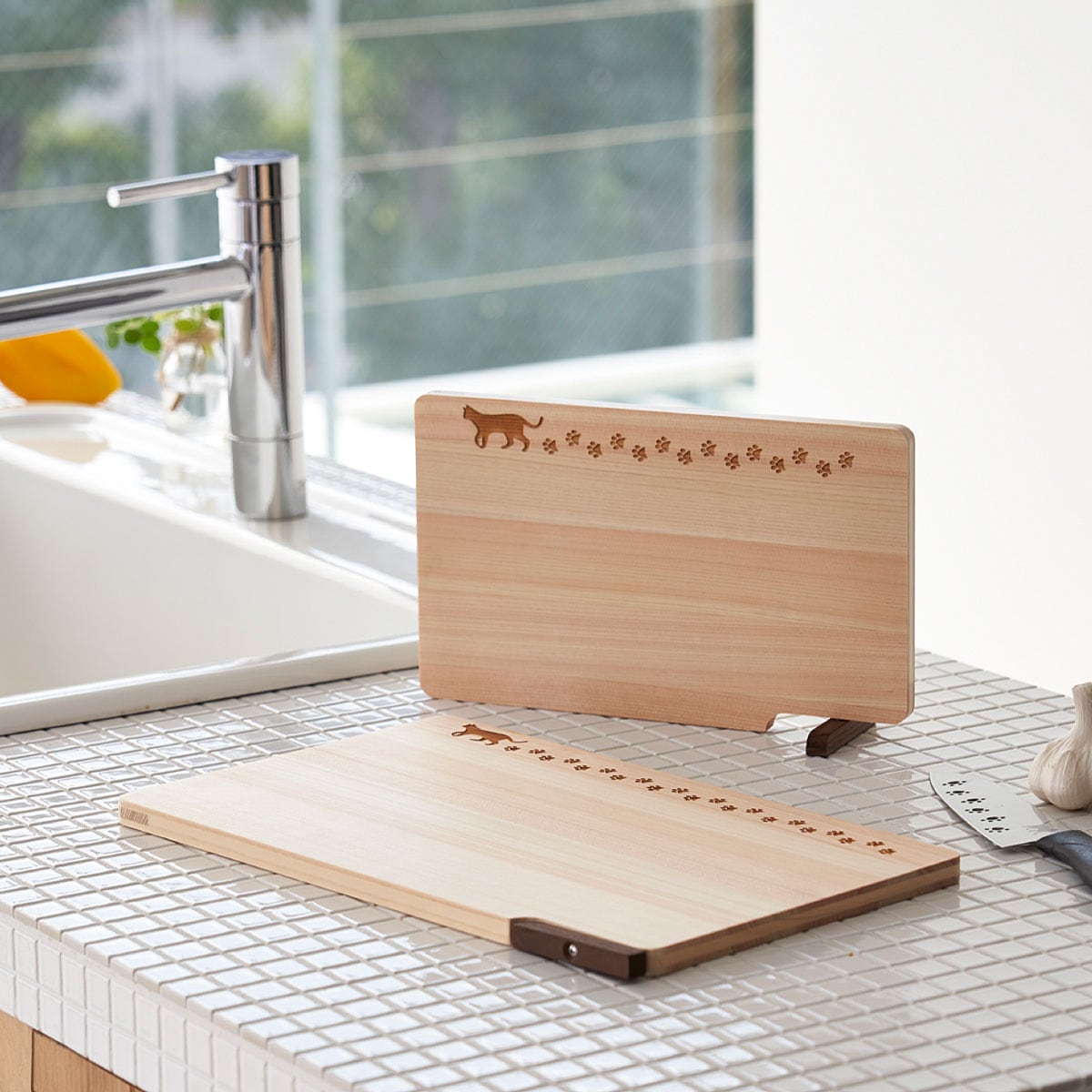 自立するひのきのまな板。猫&肉球のデザインがかわいい!奥:小 手前:大