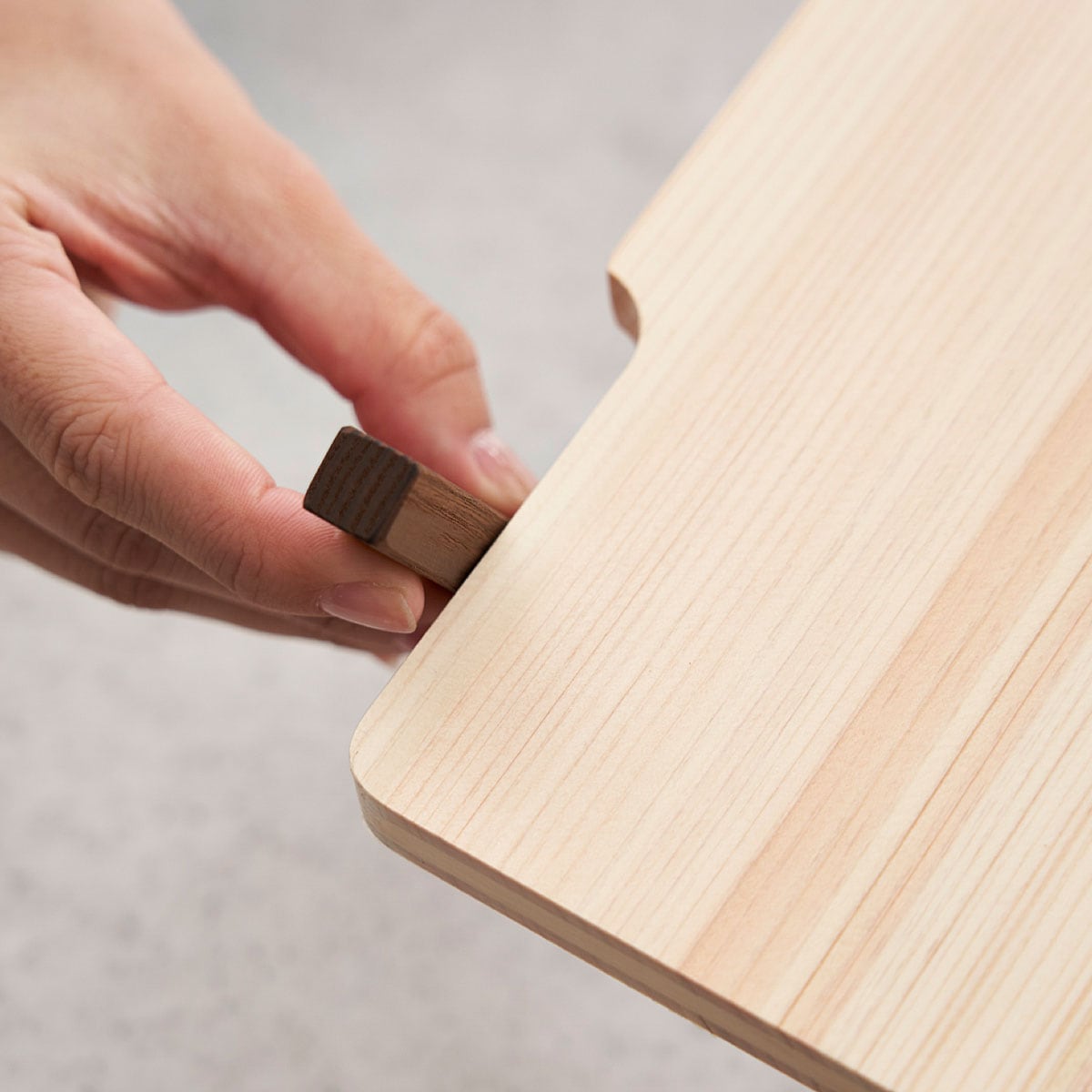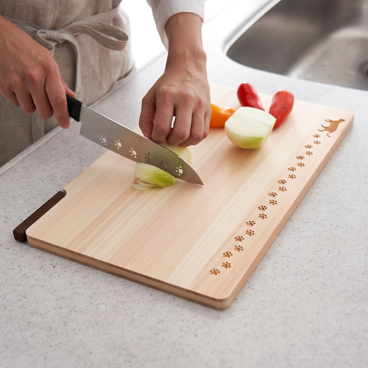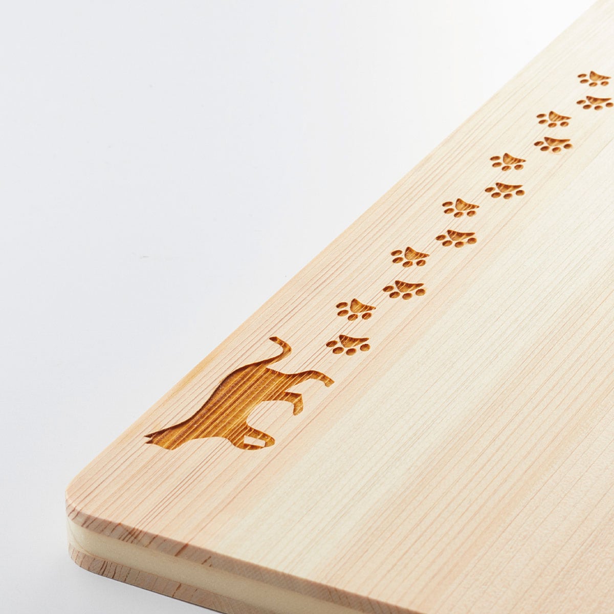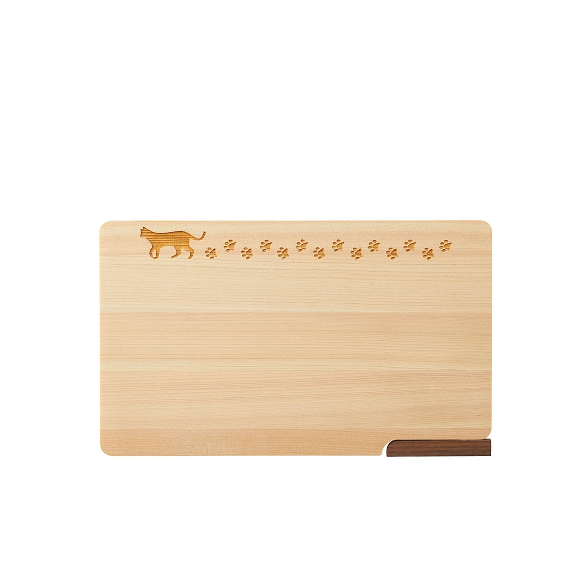 自立するひのきのまな板。猫&肉球のデザインがかわいい!奥:小 手前:大