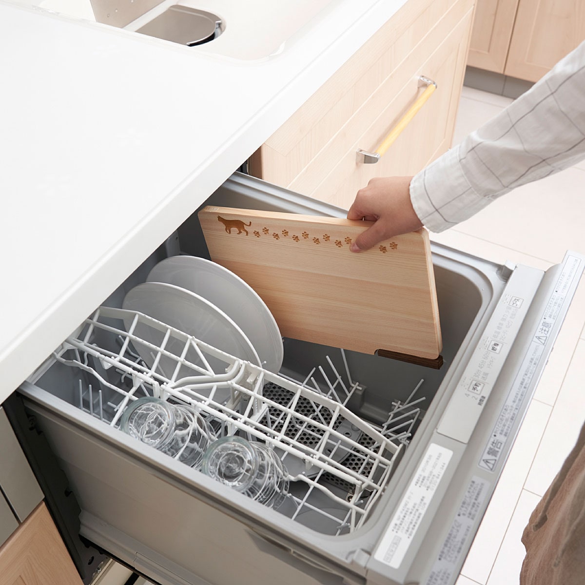 食器洗い乾燥機対応のひのきまな板。便利なスタンド仕様で収納場所に困りません。ネコのモチーフがとってもカワイイまな板です。
