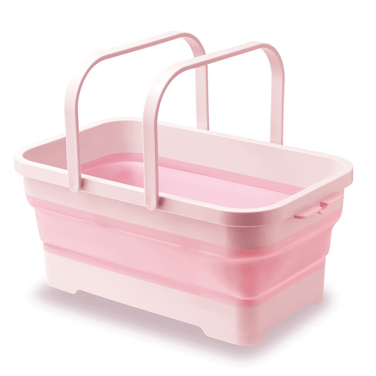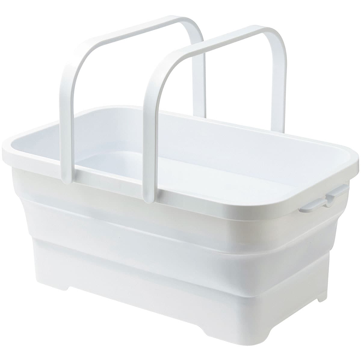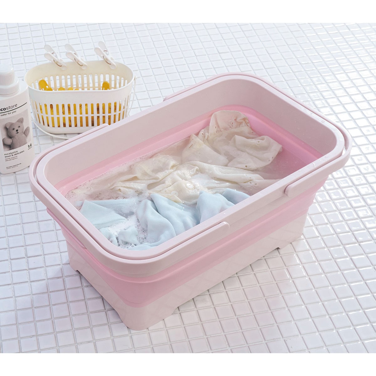 洗濯物のつけ置き洗いに折りたためて収納場所を取らない、取っ手付きのバスケットです。