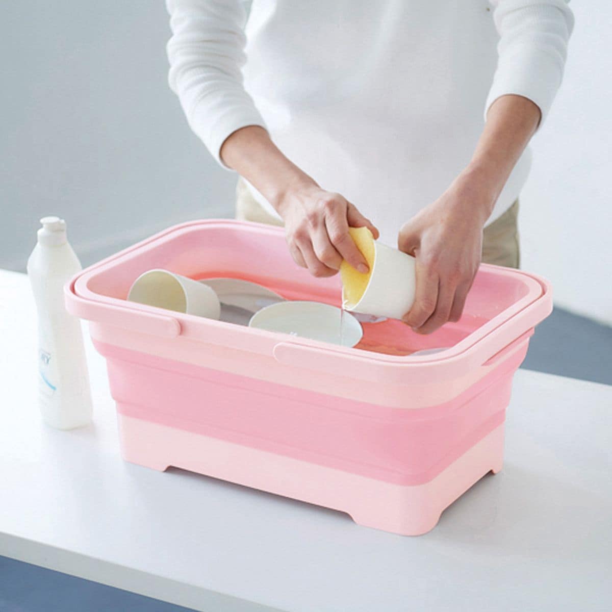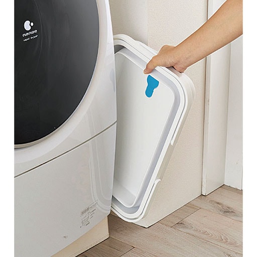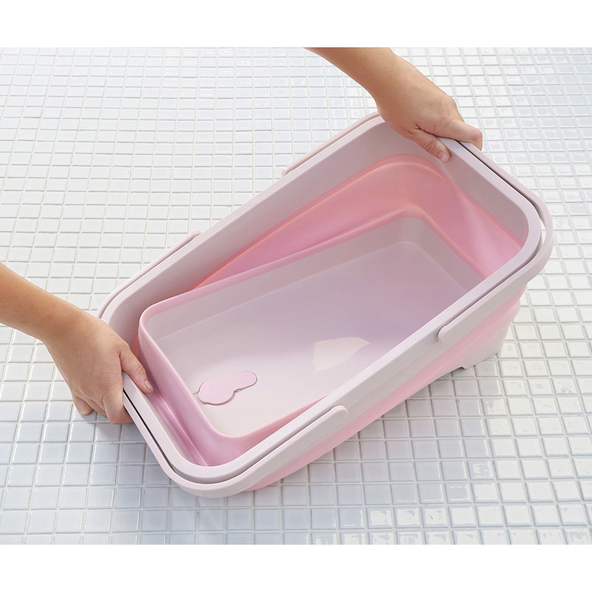 洗濯物のつけ置き洗いに折りたためて収納場所を取らない、取っ手付きのバスケットです。