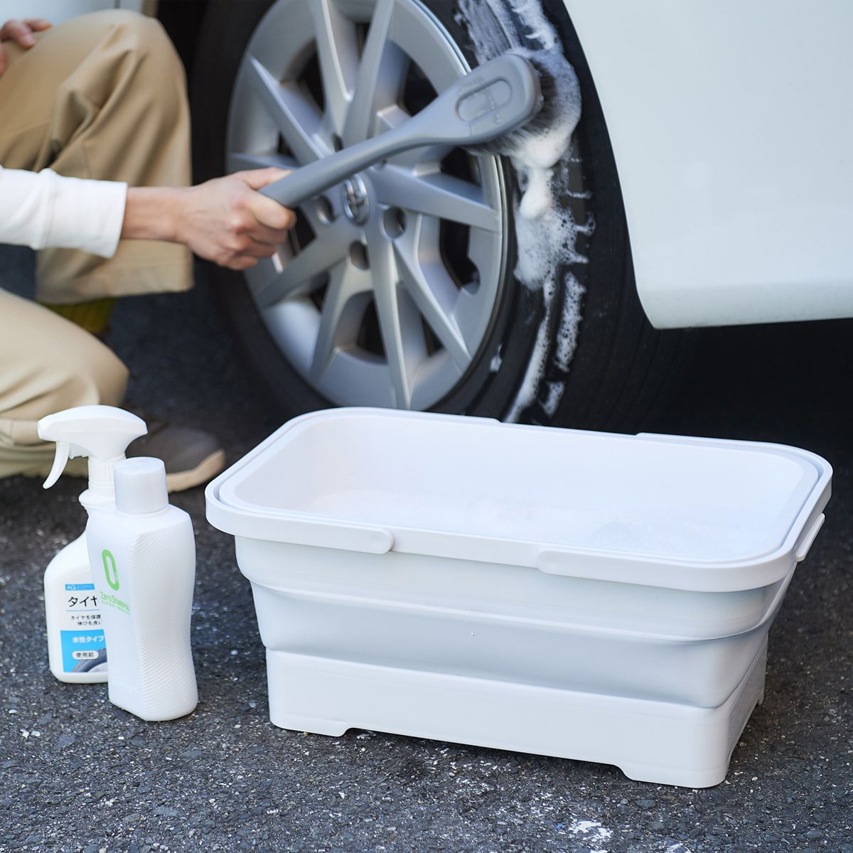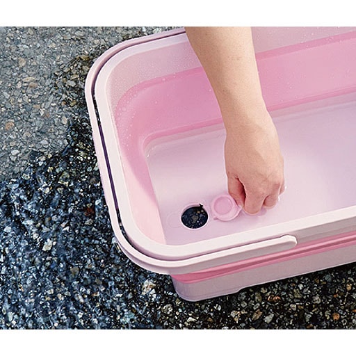 ■[本体・水抜き栓]熱可塑性エラストマー [枠・底・ハンドル]ポリプロピレン ■サイズ(約cm)/46.3×29×高さ(組立時:19.6、折りたたみ時:6.8) ●容量/15L ■耐熱温度/100℃ ■耐冷温度/-20℃●日本製