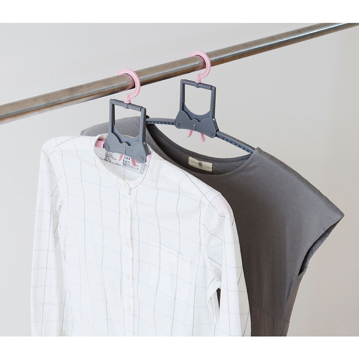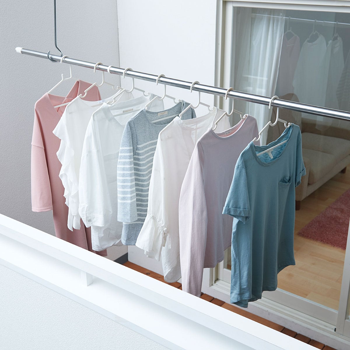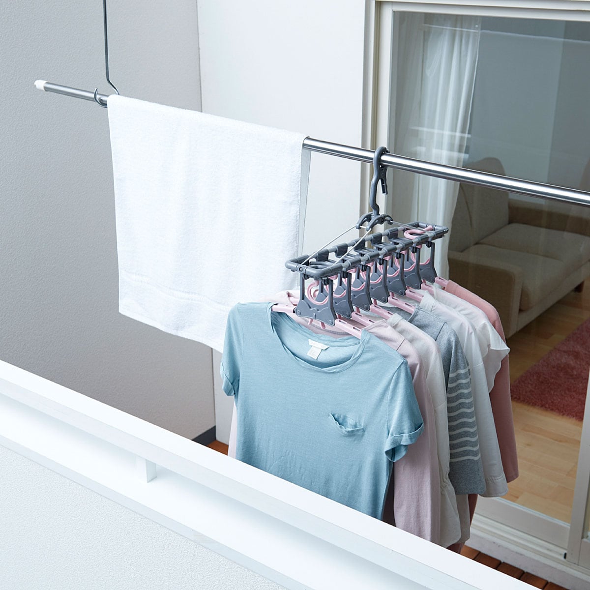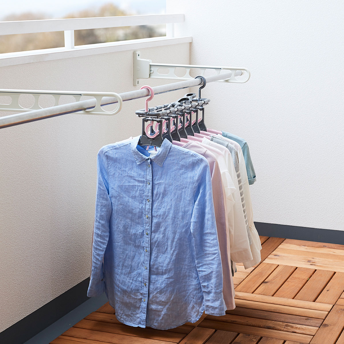 省スペースで7着の洋服が干せます。フレームから取り外せば単体のハンガーとしても使えます。風通りの良い穴あきアーム(ショルダー部)を採用し、服(肩幅)のサイズによって大きさを調整できます。ハンガー下部のつまみを押せばアームがたためるので、干すときに襟ぐりが広がらず、取り入れ時はワンタッチでハンガーから取り外しが可能。