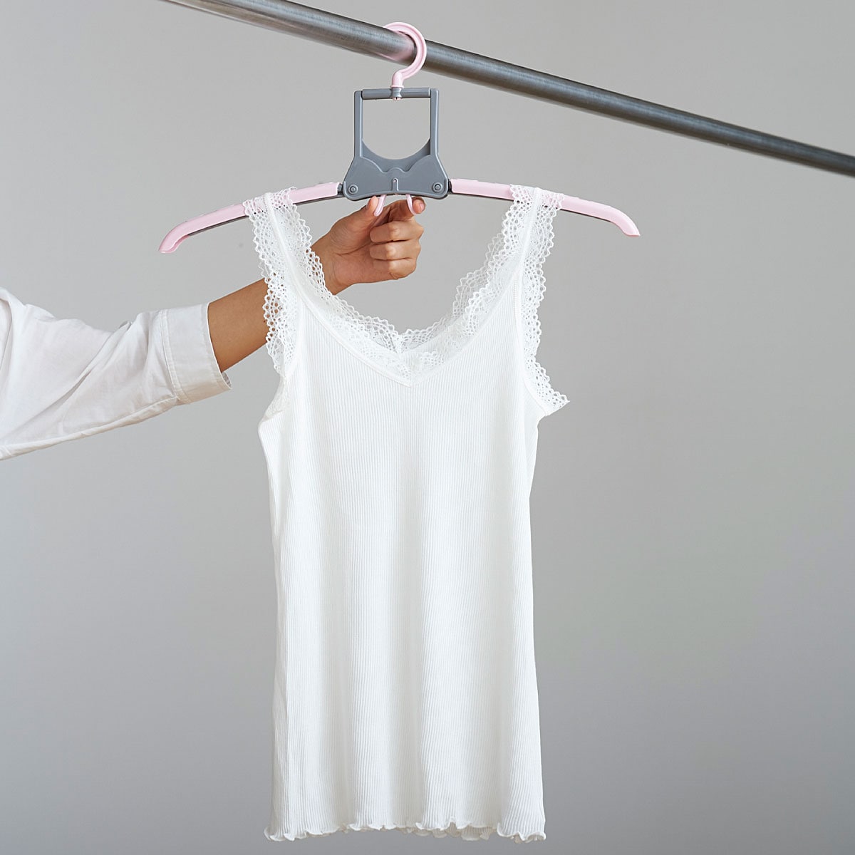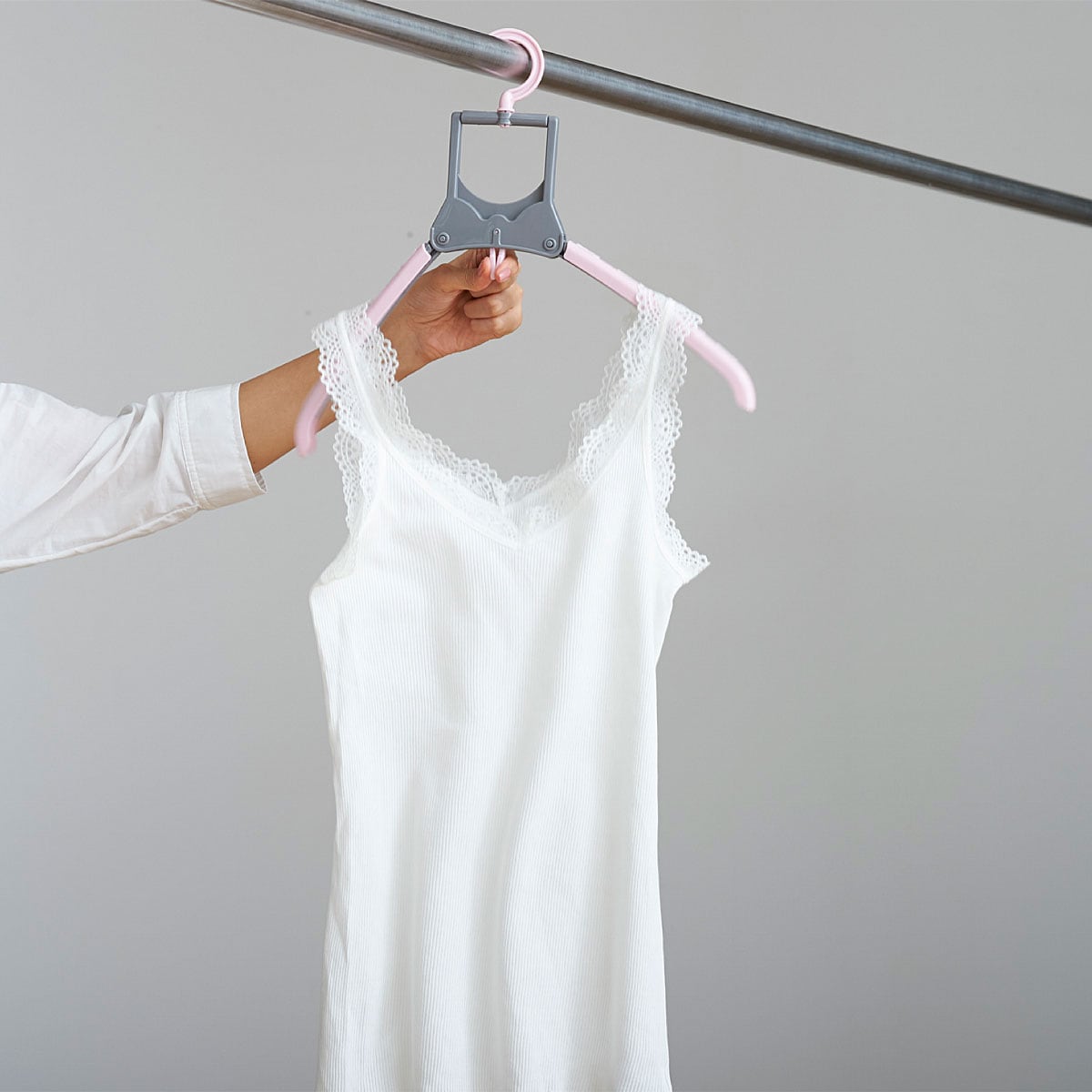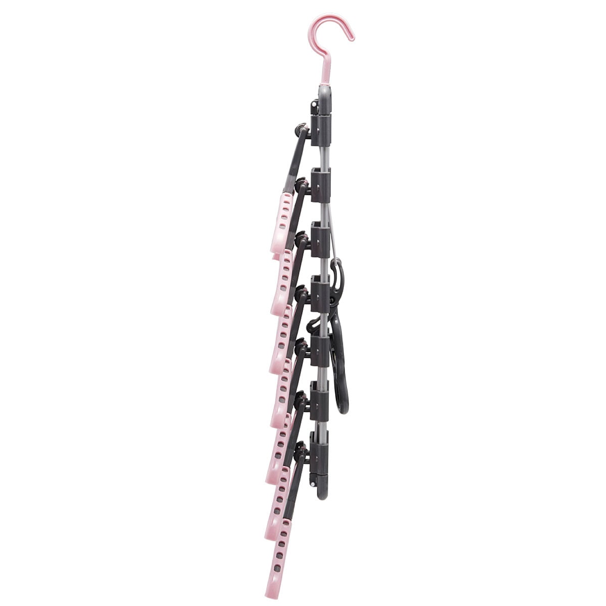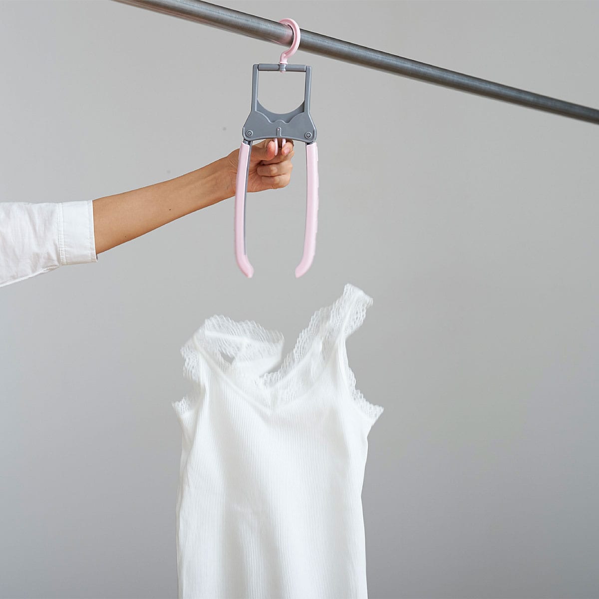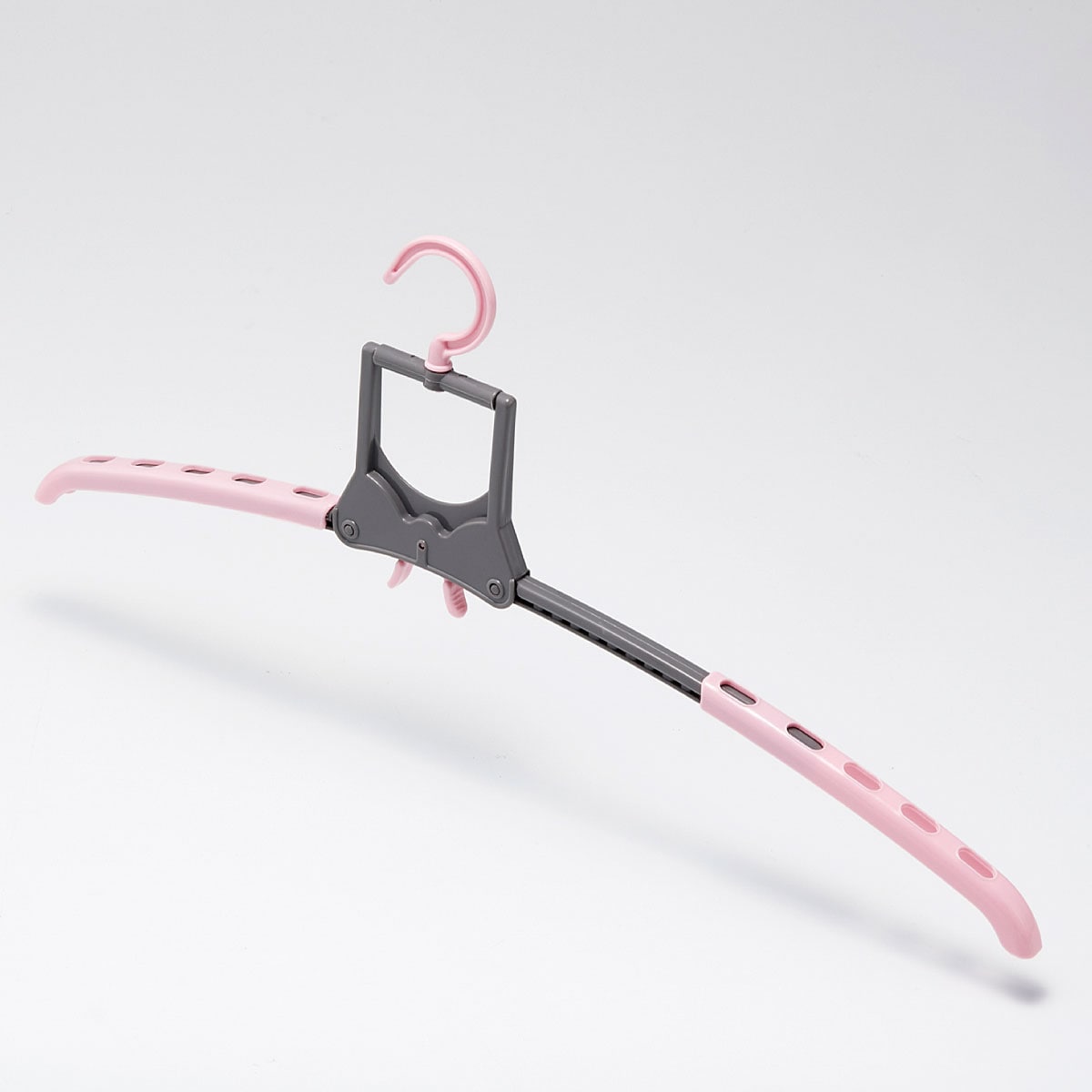 省スペースで7着の洋服が干せます。フレームから取り外せば単体のハンガーとしても使えます。風通りの良い穴あきアーム(ショルダー部)を採用し、服(肩幅)のサイズによって大きさを調整できます。ハンガー下部のつまみを押せばアームがたためるので、干すときに襟ぐりが広がらず、取り入れ時はワンタッチでハンガーから取り外しが可能。