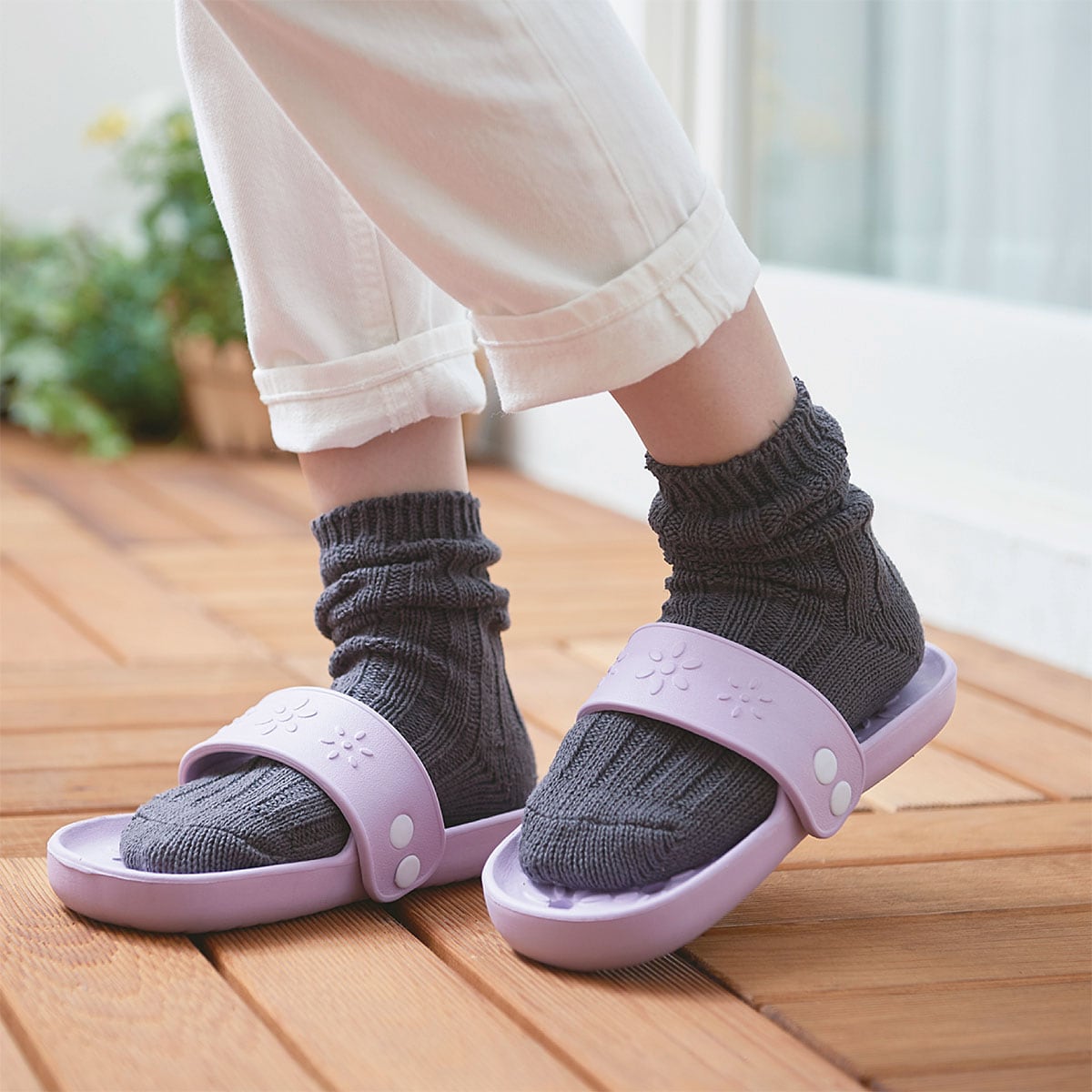 サンダルの向きを変えなくていいので、荷物を持っている時もサッと履くことができます。洗濯物をベランダで干す時やゴミ出しの時におすすめです。