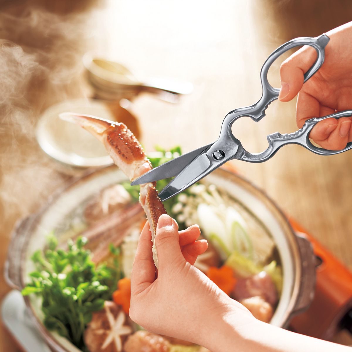 ギザ刃なので、滑らず食材をとらえてしっかり切ることができます。鶏皮などのやわらかい食材から、カニの殻など硬いモノも簡単にカットできます。