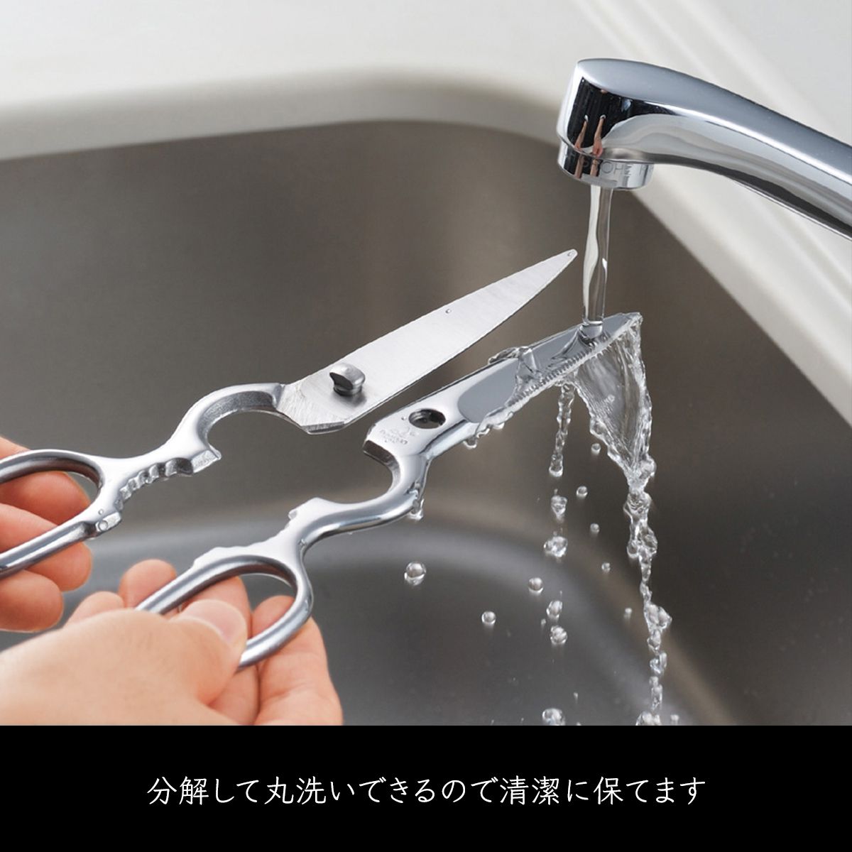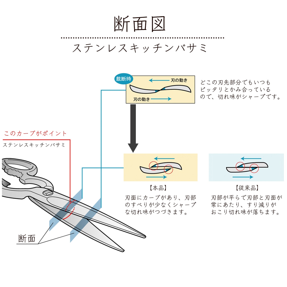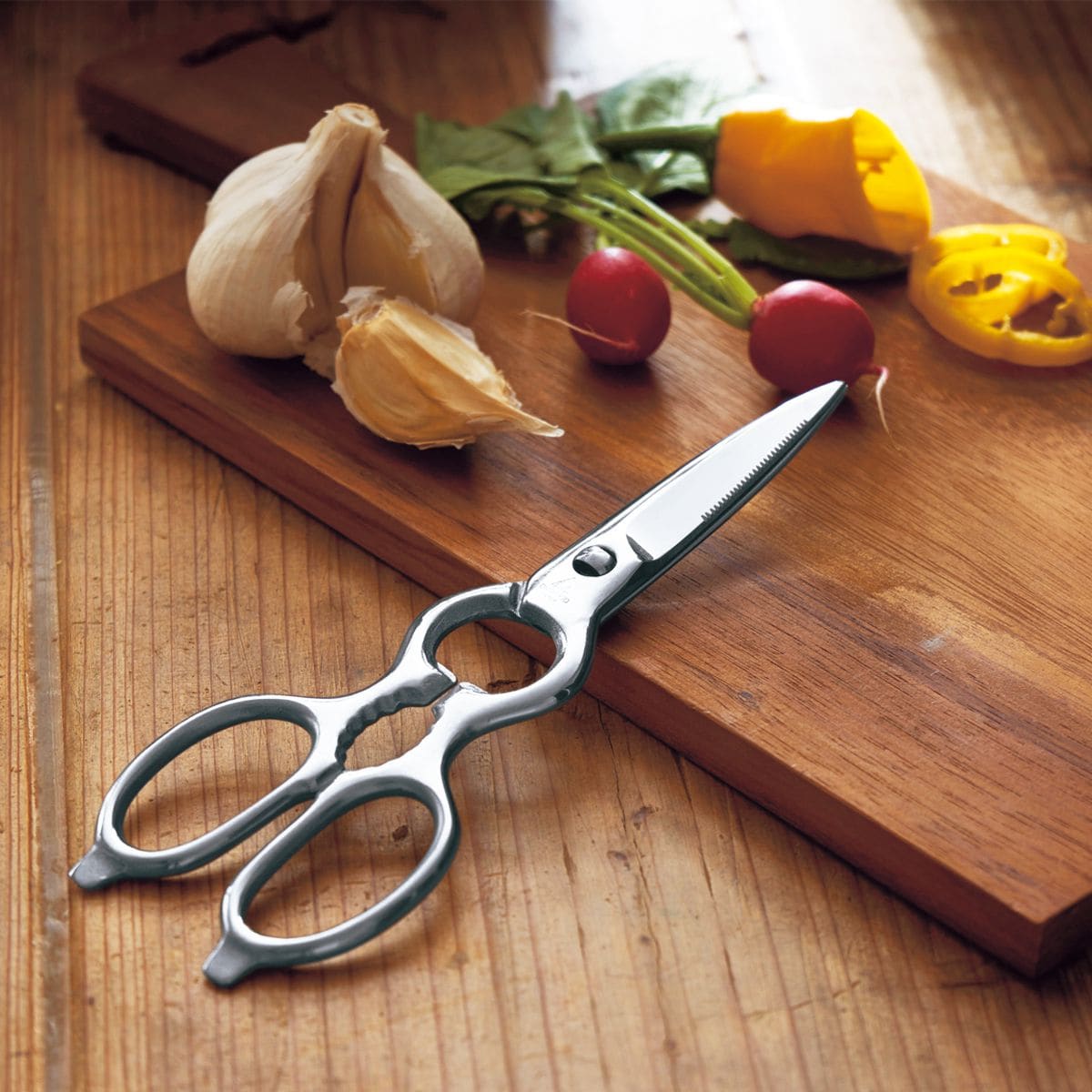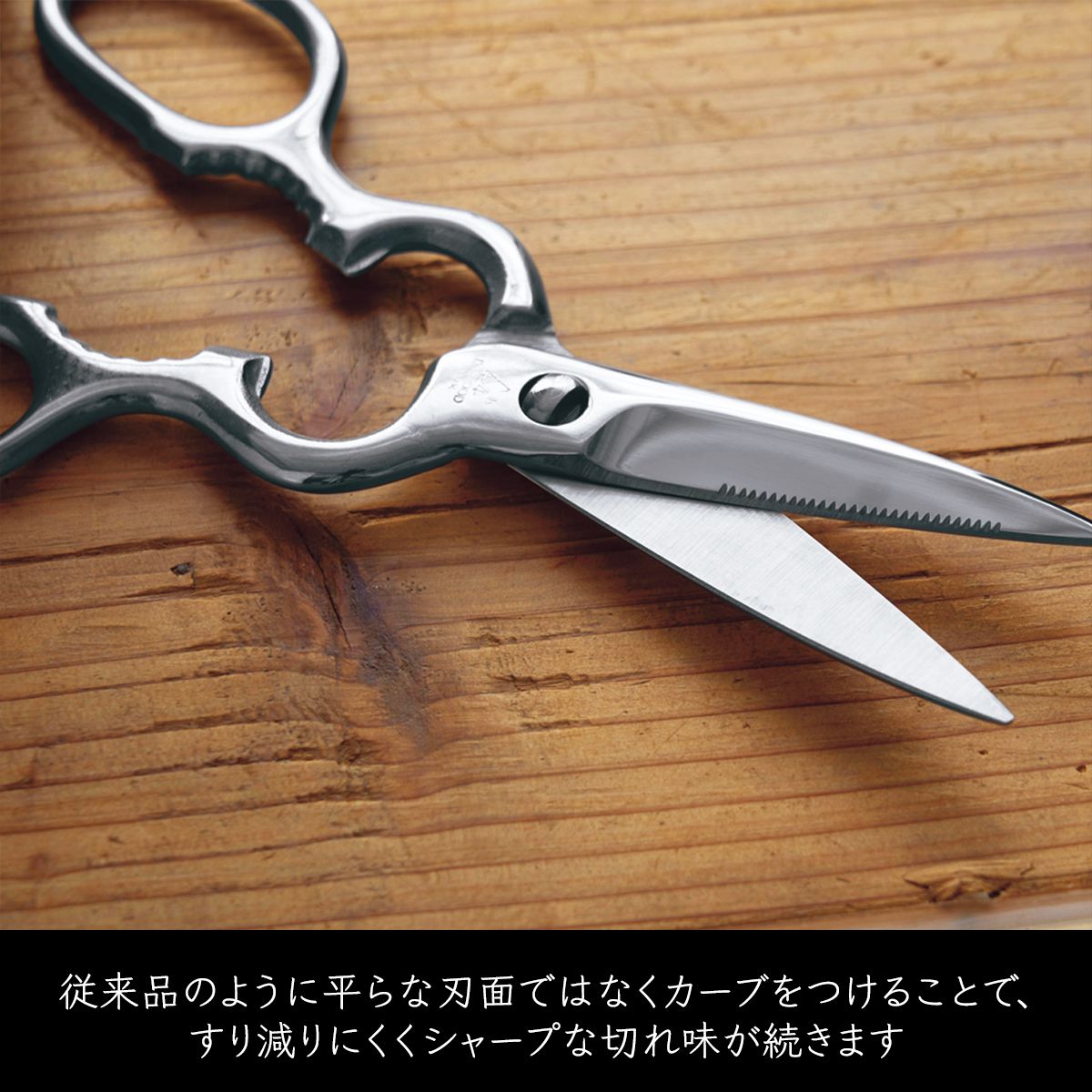 金物の町、新潟県三条市で約70年もの歴史を持つ刃物メーカーの職人たちが熟練の技を駆使し、手間をかけて作り上げたステンレス製のキッチン用ハサミ。約1200~1300度で熱した素材に、約1トンもの圧力をかけて打ち付け、不純物を取り除き強度を高める「鍛造」という技術を取り入れ、丈夫さと切れ味の良さを追求しました。さらに刃面にカーブをつけ、刃と刃があたる面積を少なくすることで刃の消耗を軽減し、切れ味が長持ちするよう工夫。薬味のカットから骨のある硬い食材まで幅広く活用でき、料理が一段とはかどる一生モノのキッチンハサミです。