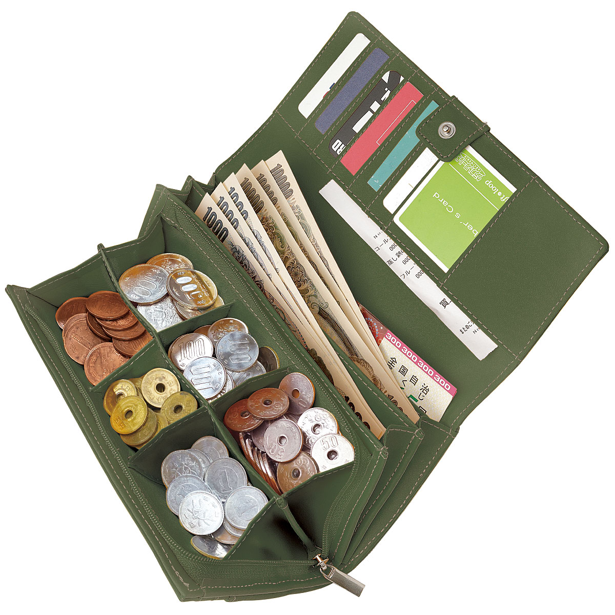 グリーン6分割で小銭がスッキリ コイン仕分けポケット※イメージ ※ 商品をわかりやすく説明する為、硬貨を多く入れています。