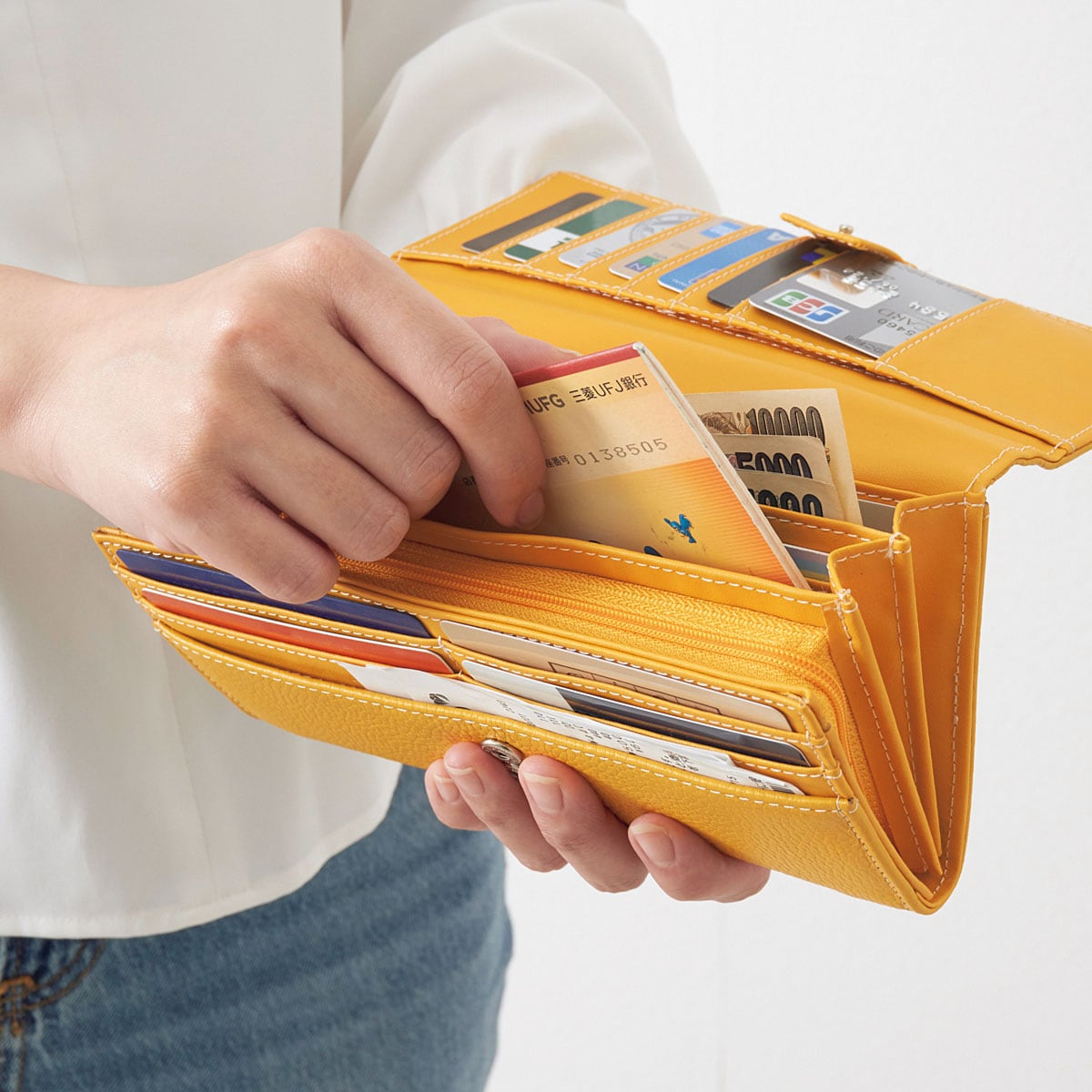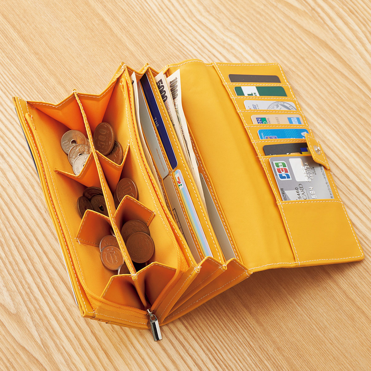 イエロー多彩なポケットで、お札・カード・通帳などを仕分け収納できます。