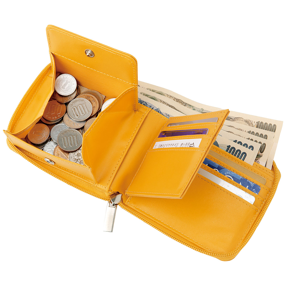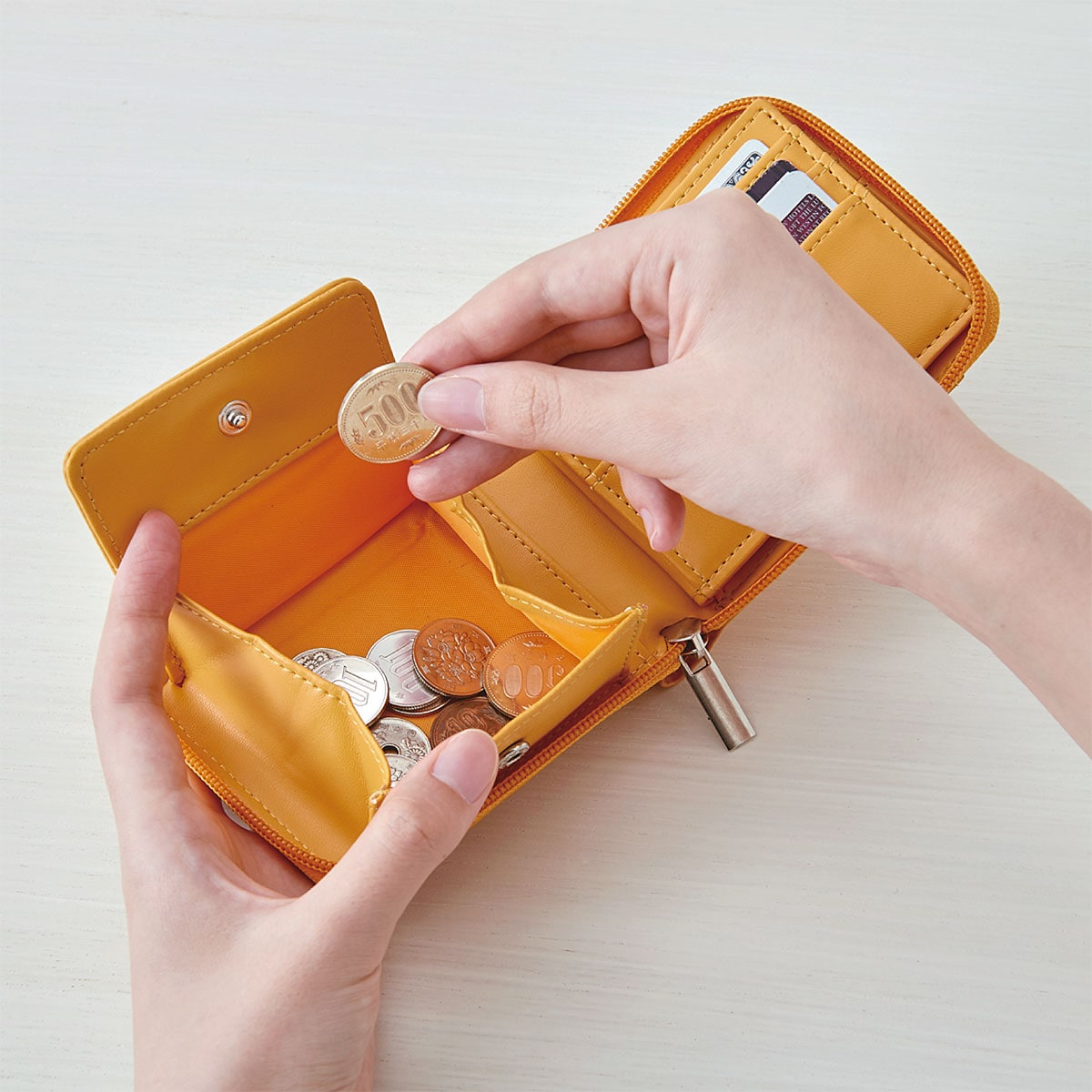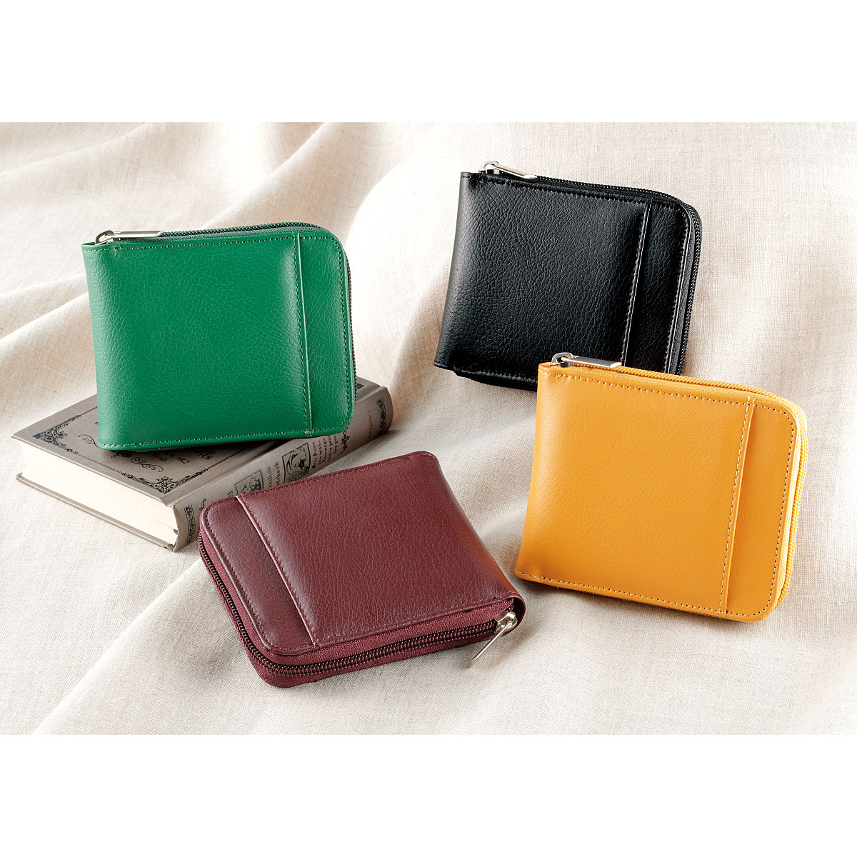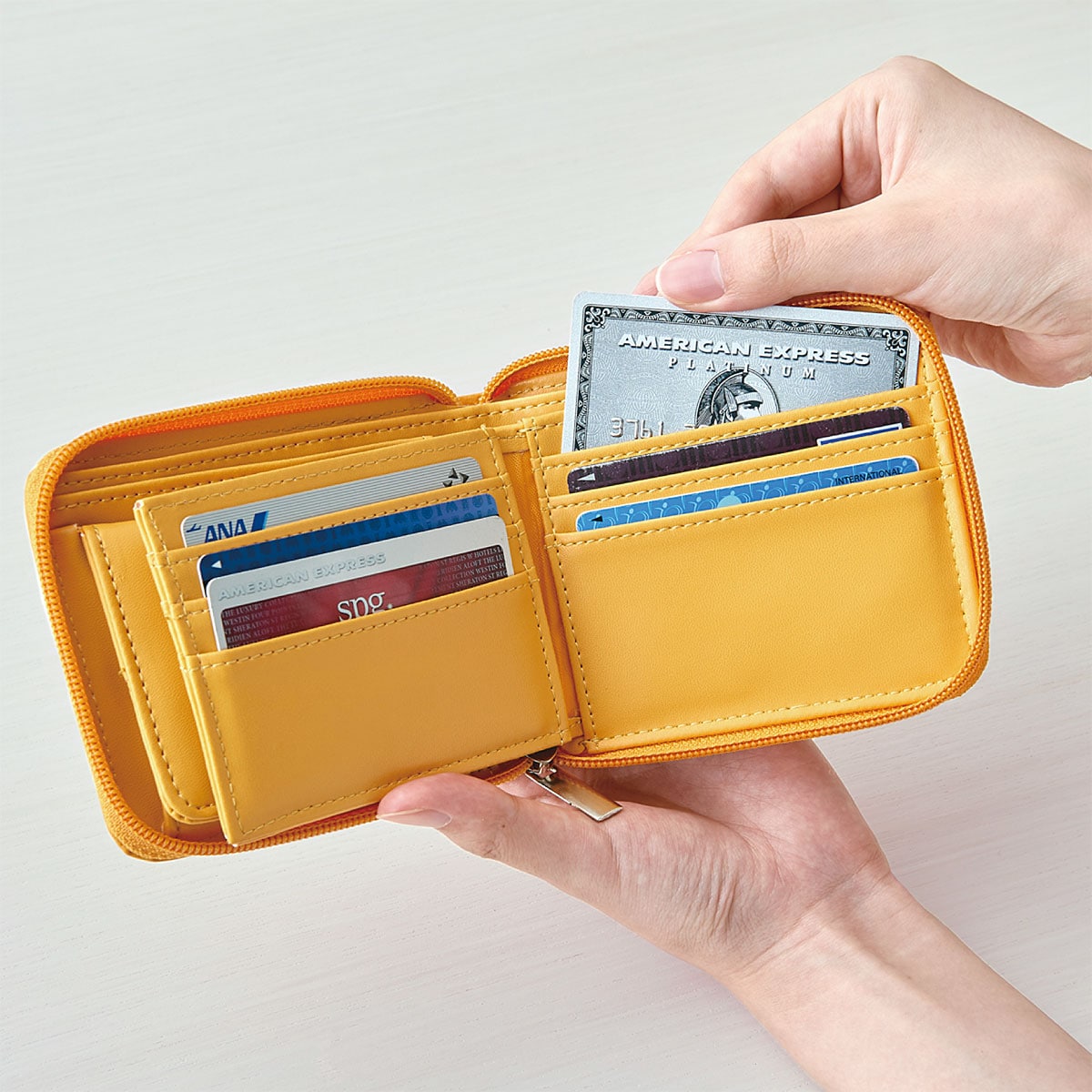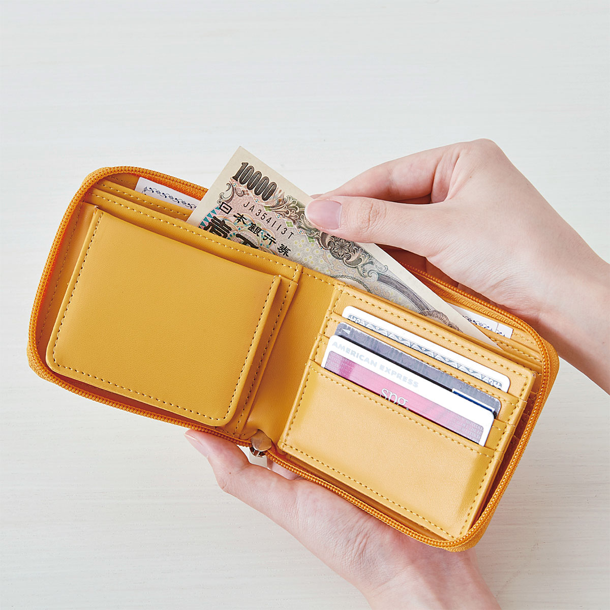コンパクトサイズで使い勝手の良い2つ折りラウンドファスナー式のウォレット。男女問わずご使用いただけます。ーデザインーコンパクトなのに収納力はたっぷりで、コロンと可愛いスタイルが魅力です。大きく開く小銭入れ、9個のカード入れなど、機能性も申し分なし。外側には、交通系ICカードやポイントカードなどよく使うカードを収納するのに便利なポケット付き。