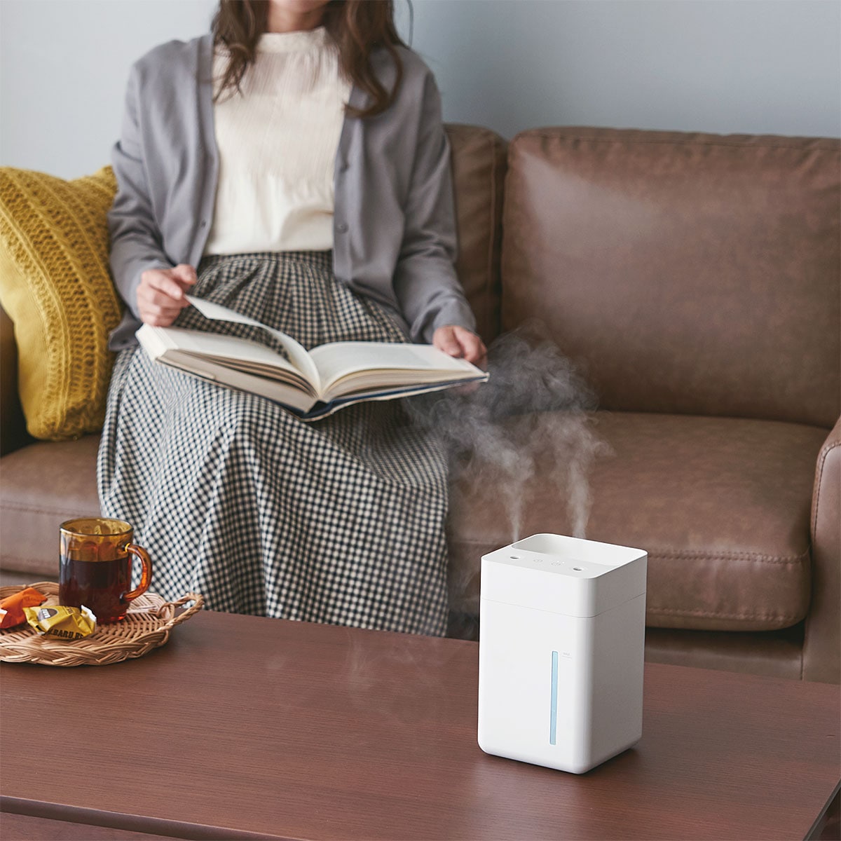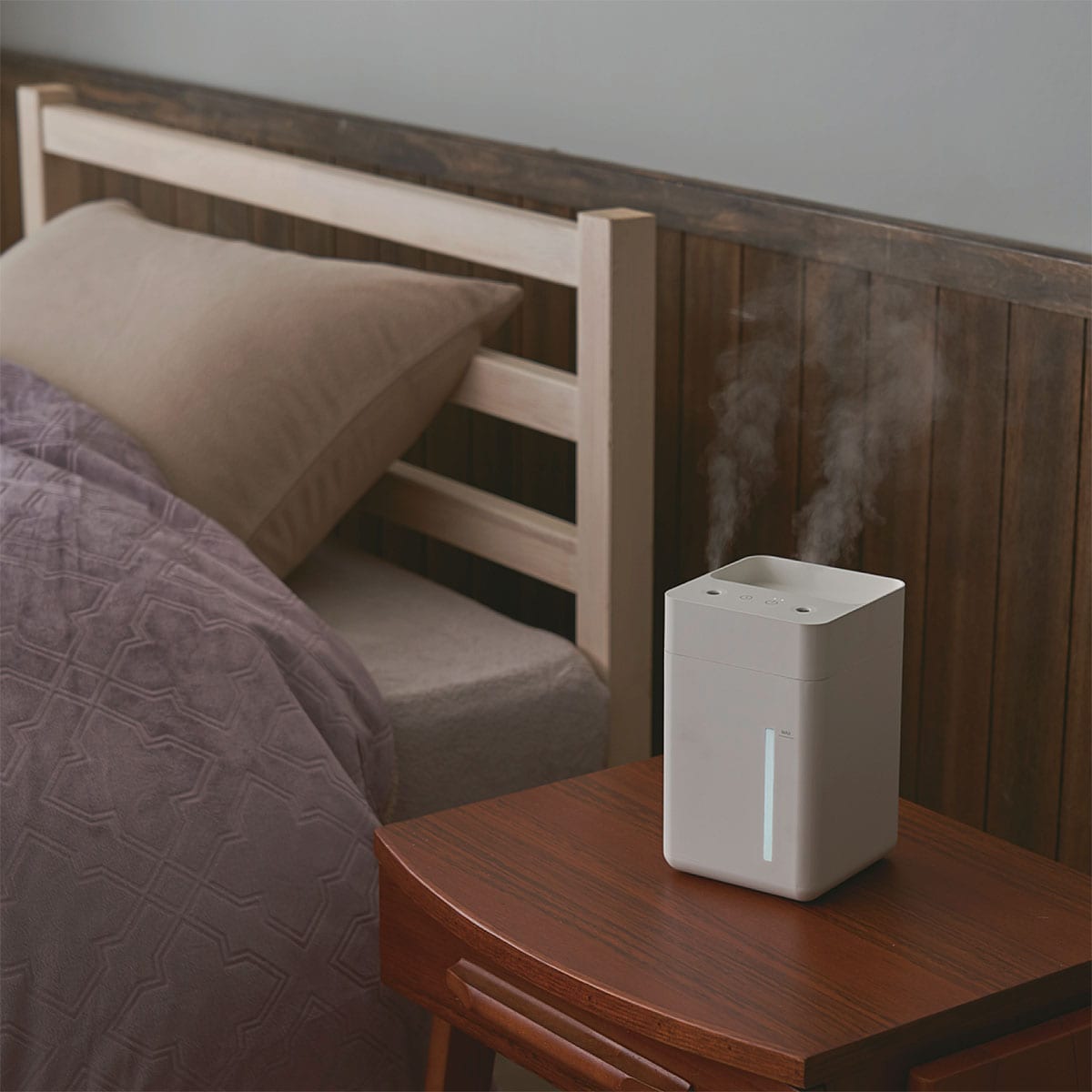 電源を気にせずいろいろな場所で手軽に使える加湿器。オフタイマー付きなのでおやすみタイムにもおすすめです。インテリアに馴染むシンプルデザインも魅力。