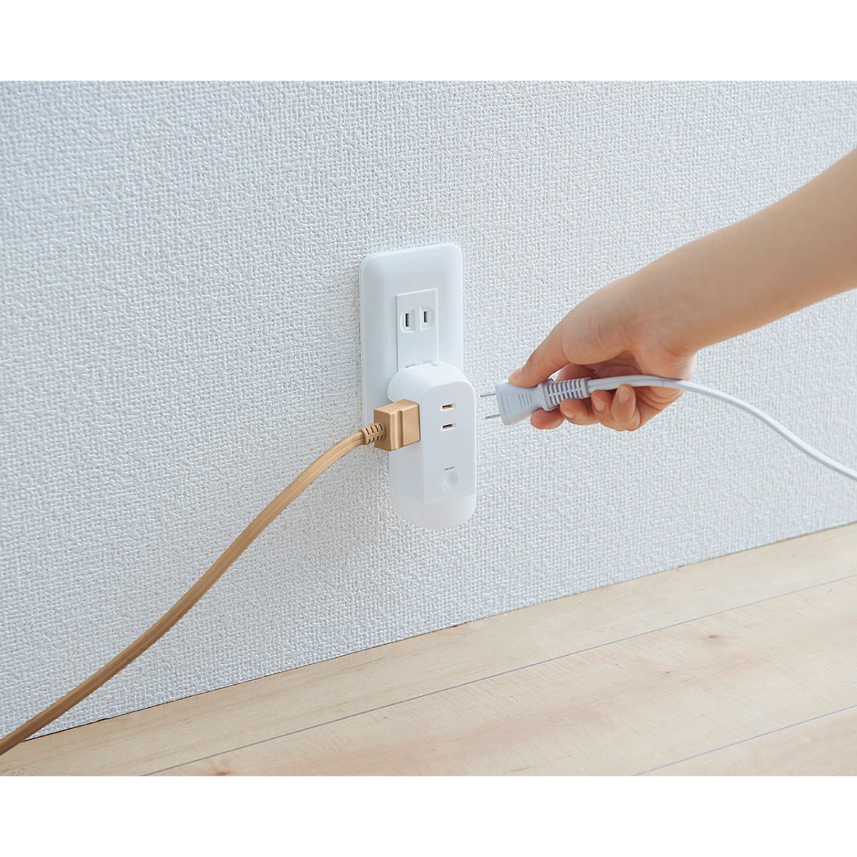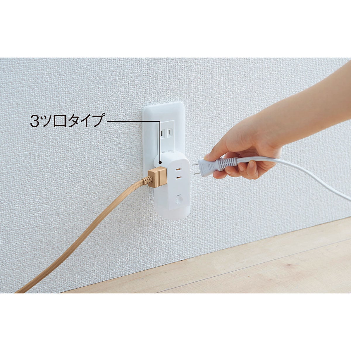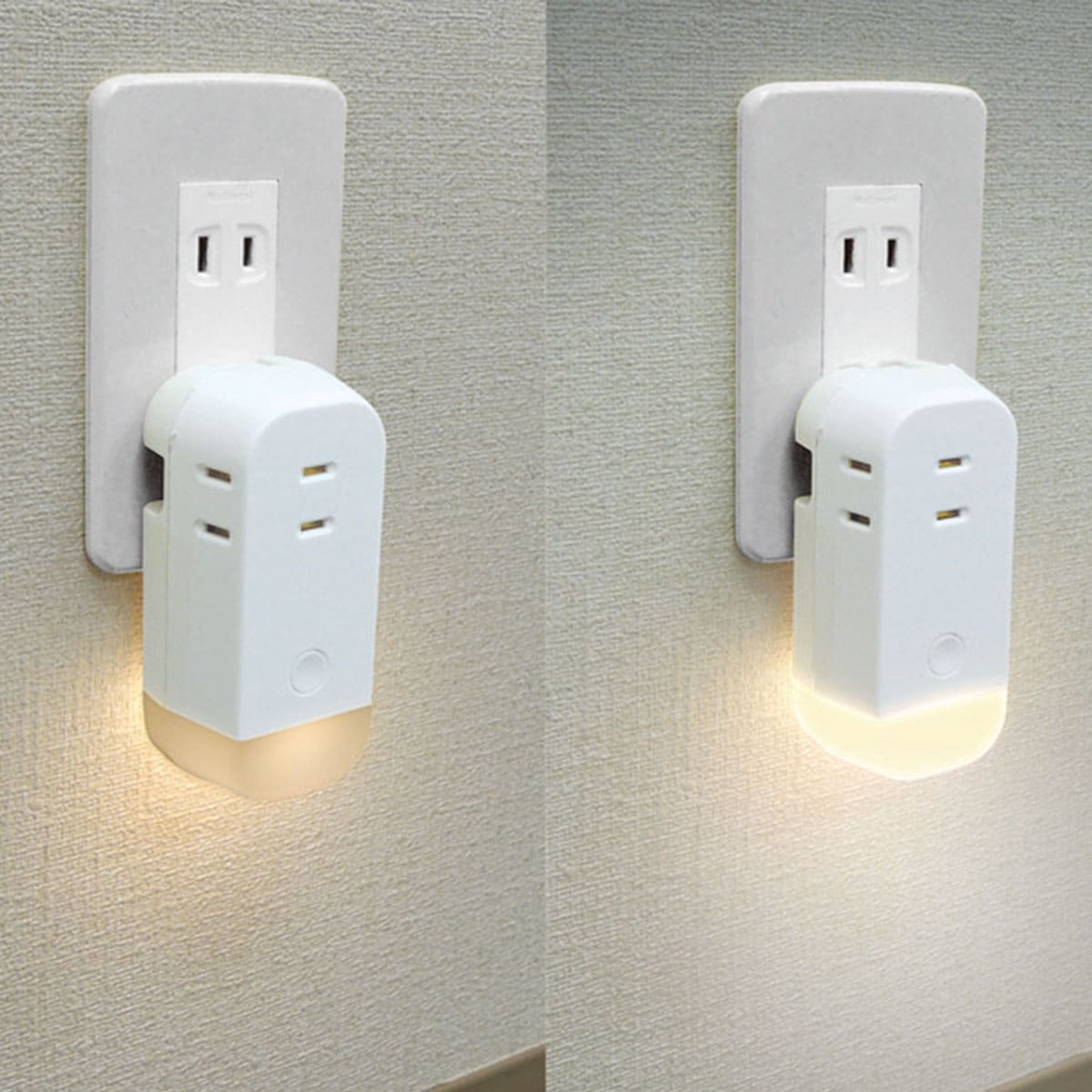 LEDライト付きのコンセントタップ。いつもは3口のコンセントタップとして使用、停電時は自動で点灯し非常灯に。ライトはコンセントに差し込むだけで充電され、コンセントから外すと懐中電灯として使用できます。電気の使用量が増えブレーカーが落ちやすくなる季節はブレーカーまでの目印として設置しておいても便利です!