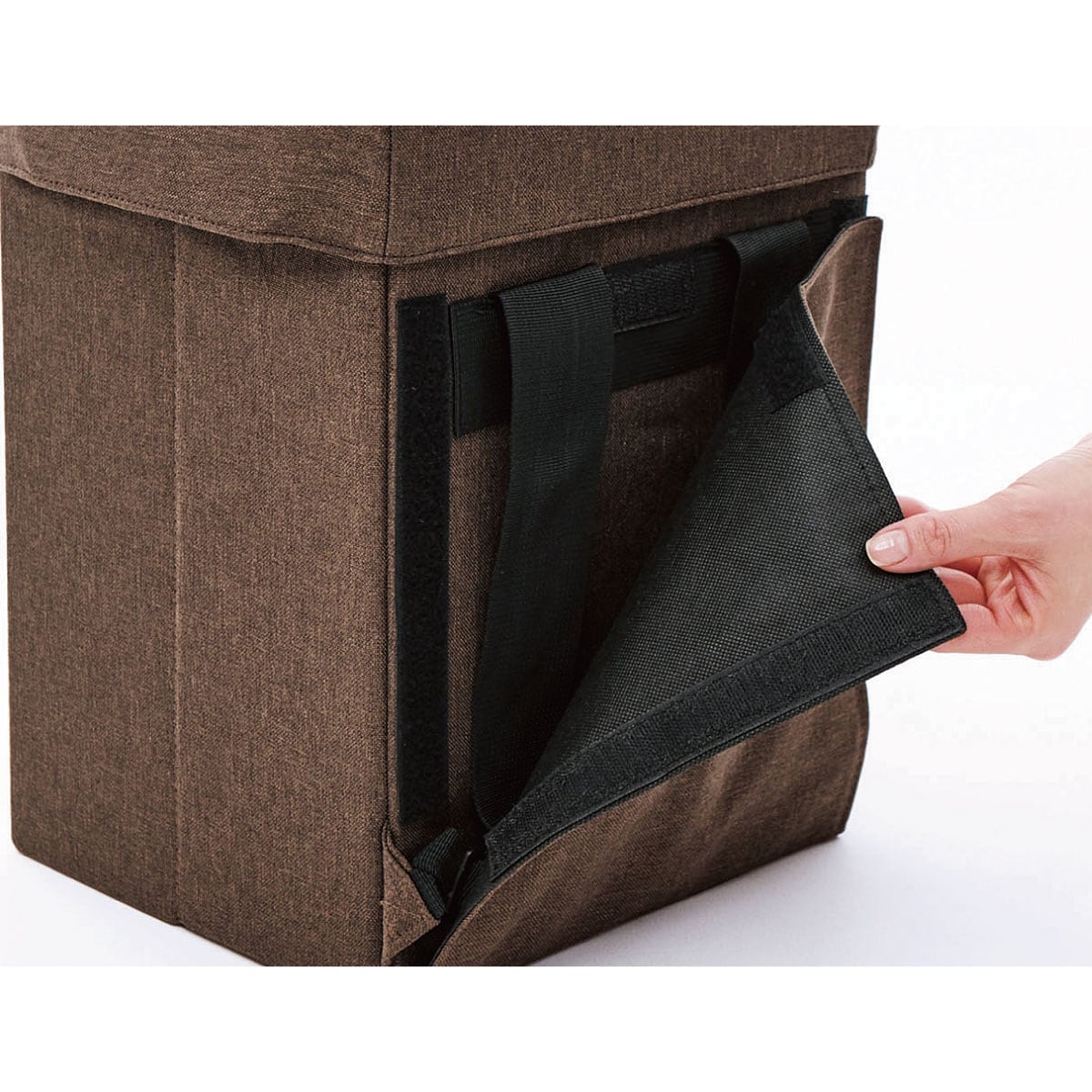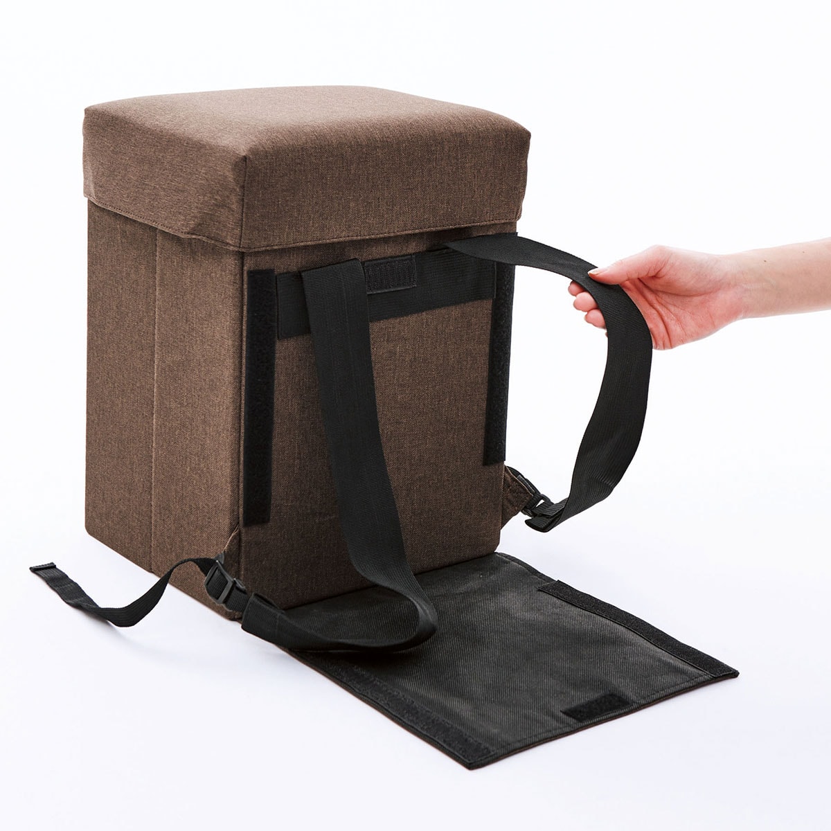 リュックベルトの付いたスツールチェアです。チェアの中に防災用具を収納しておけば、いざという時は防災リュックに早変わり。玄関に防災用品があれば持ち出しもスムーズ!