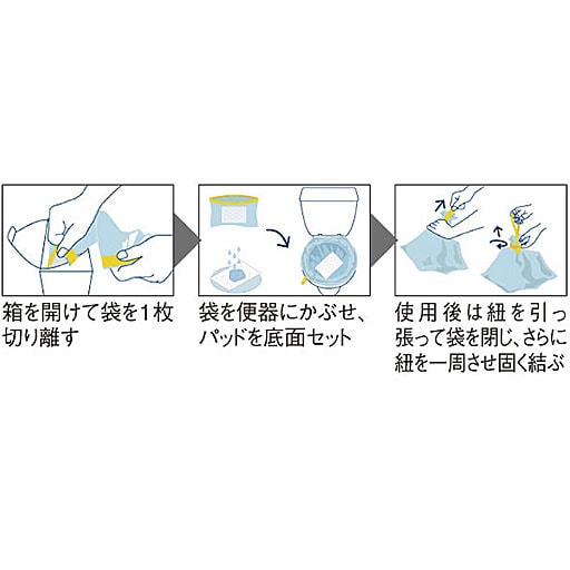 1)箱を開けて袋を1枚切り離す2)袋を便器にかぶせ、パッドを底面セット3)使用後は紐を引っ張って袋を閉じ、さらに紐を一周させ固く結ぶ