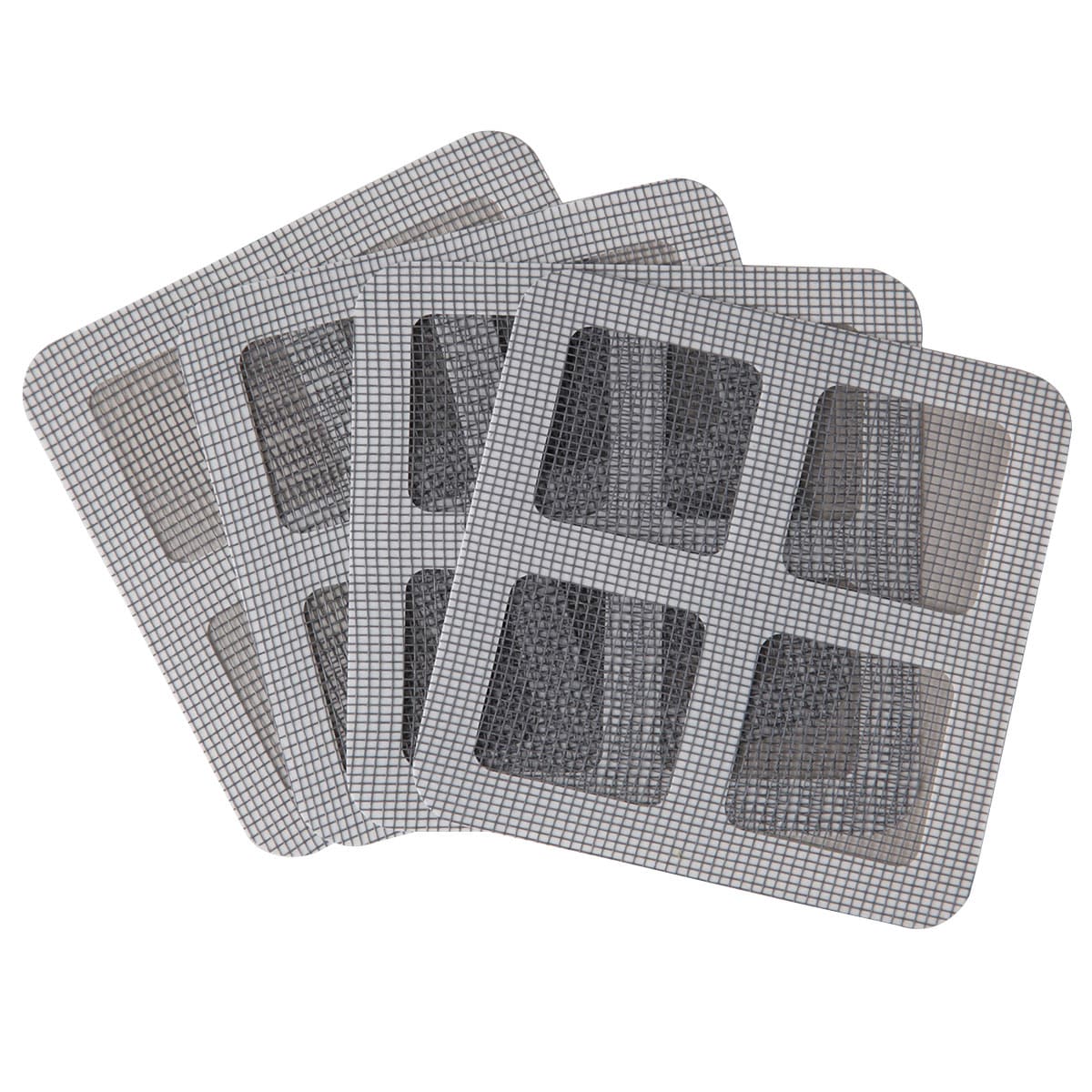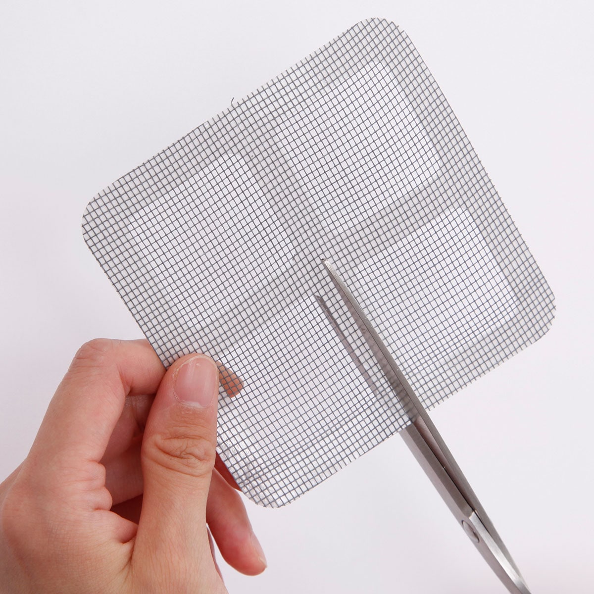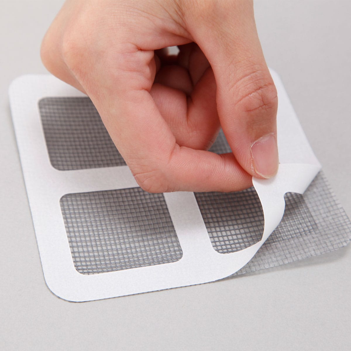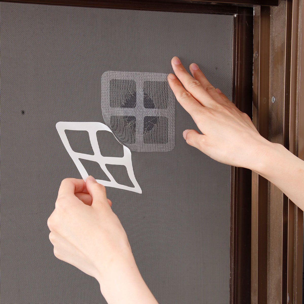 網戸の補修を簡単・手軽に。シールタイプの補修シートは補修サイズに合わせて3パターンにカット可能。大きな傷にはカットなしの10×10cm、縦・横長の傷には10×5cm、小さな傷には5×5cmとムダなく使えます。室内側の面だけ貼れば修復ができるので、とっても手軽。