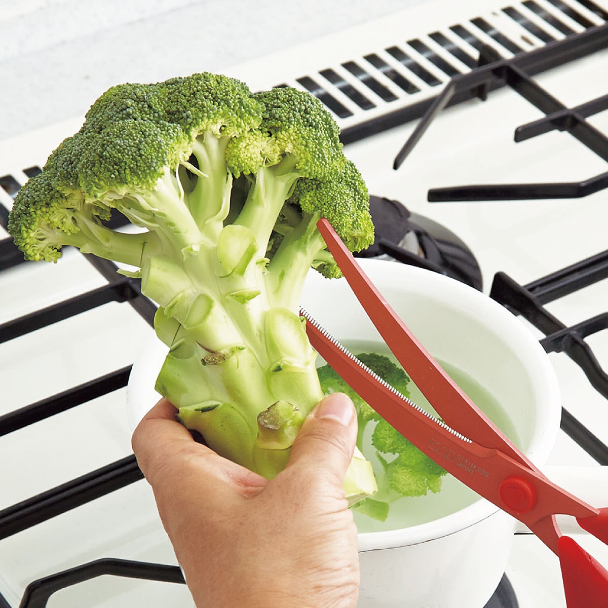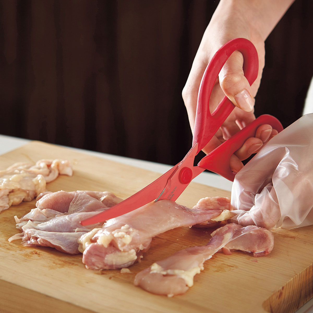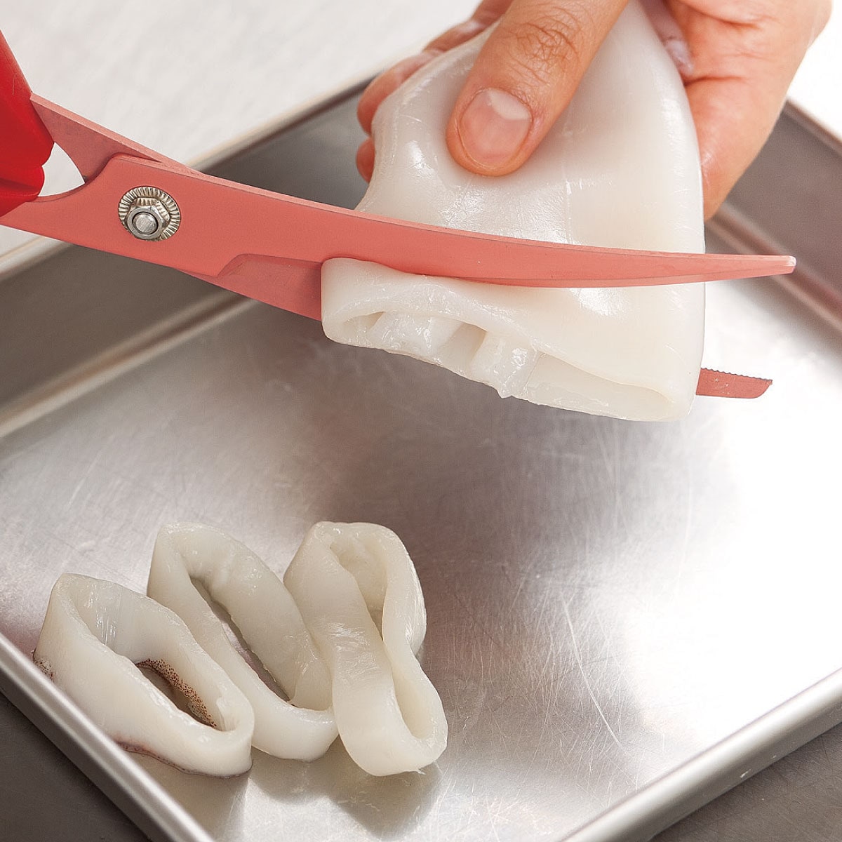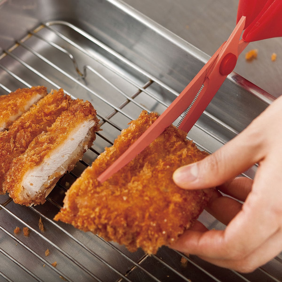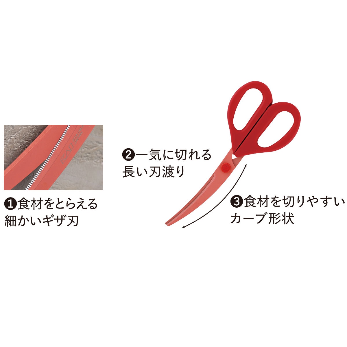厚みのあるお肉、すべりやすい魚介類、面倒な小口切りも、カーブした刃先+ギザギザ刃+長い刃渡りで、さっとスムーズにカットできます。また、包丁やまな板を使わず調理できるので後片づけがラクになって時短調理につながります。