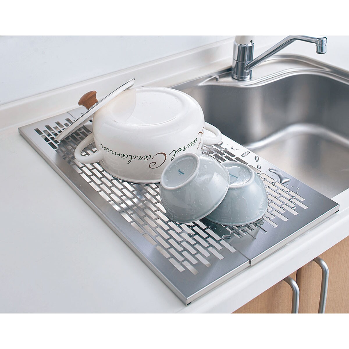 スライド式なのでお好みの幅に調節OK。穴があるので、シンク下に水を切りながら作業ができます。広げると作業スペースがぐ~ん! とアップ!薄型なので収納場所いらず!