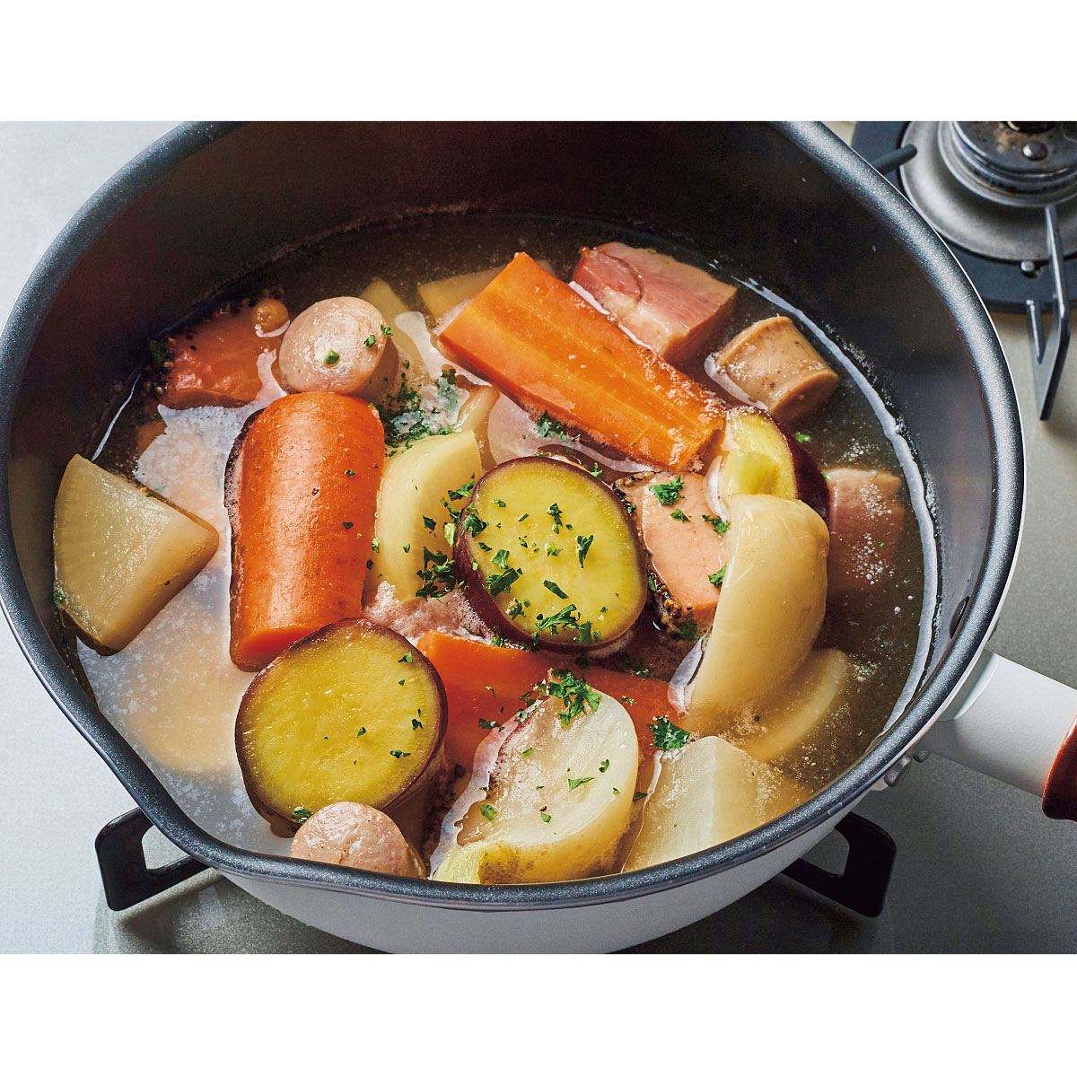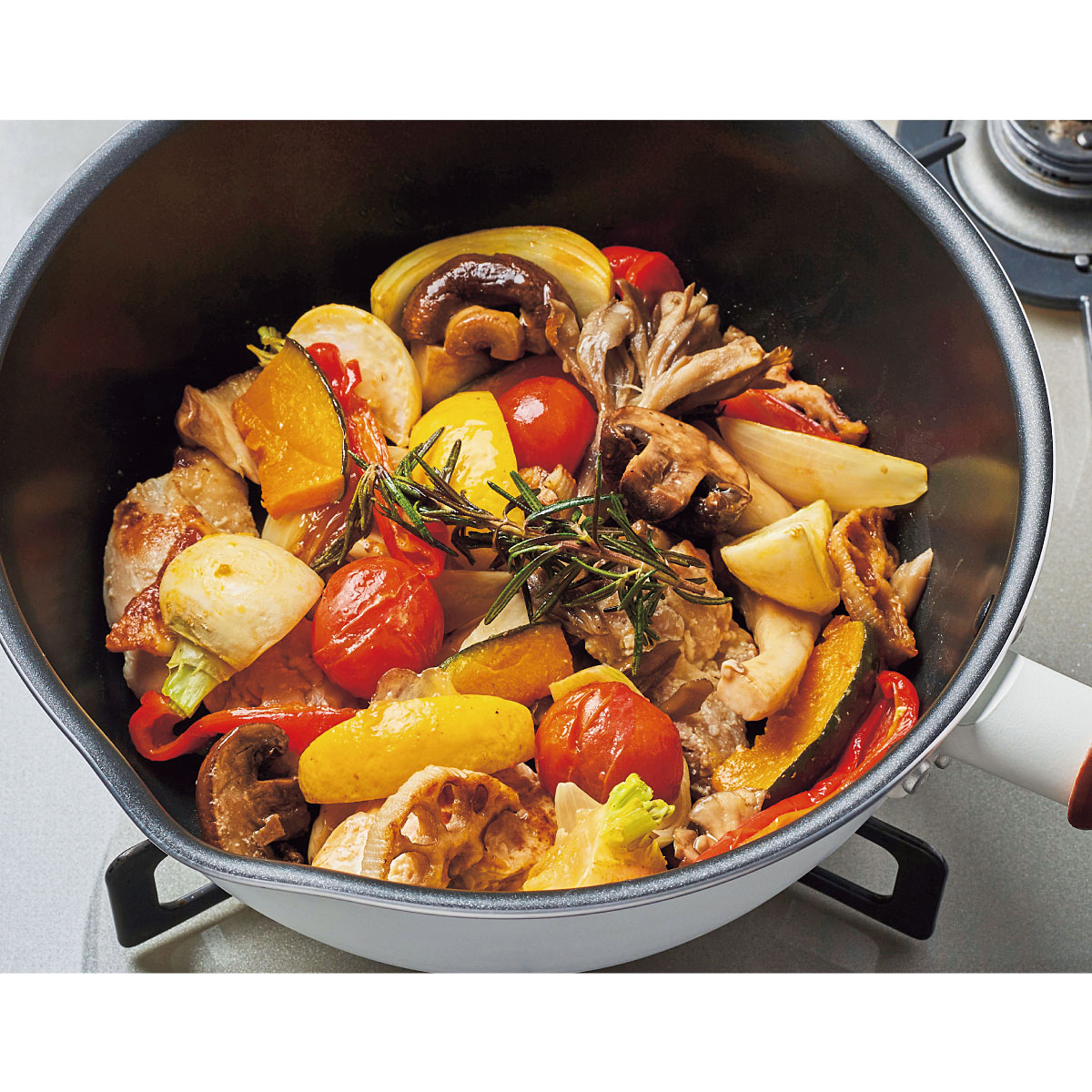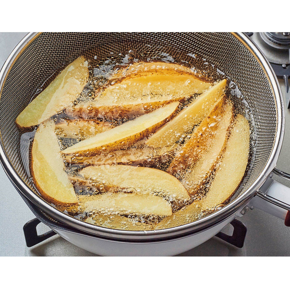 7役【2.揚げる】深い形状で、揚げ物調理時も油が飛び散りにくい