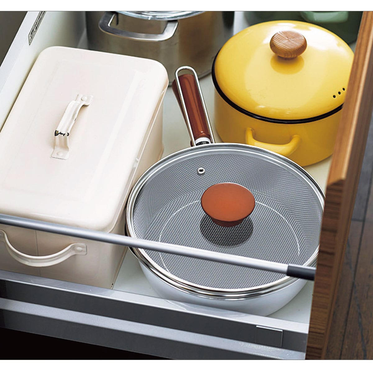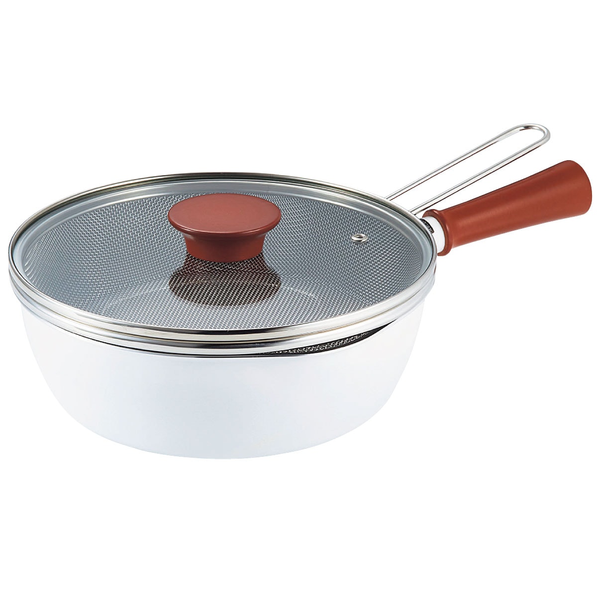 深さがあるフライパンなので使い方いろいろ!!調理中も中身が見やすいガラス蓋付き。〇短めのハンドル設計で収納時の邪魔になりにくい。〇ふっ素樹脂加工でお手入れラクラク。〇液だれしにくい注ぎ口。