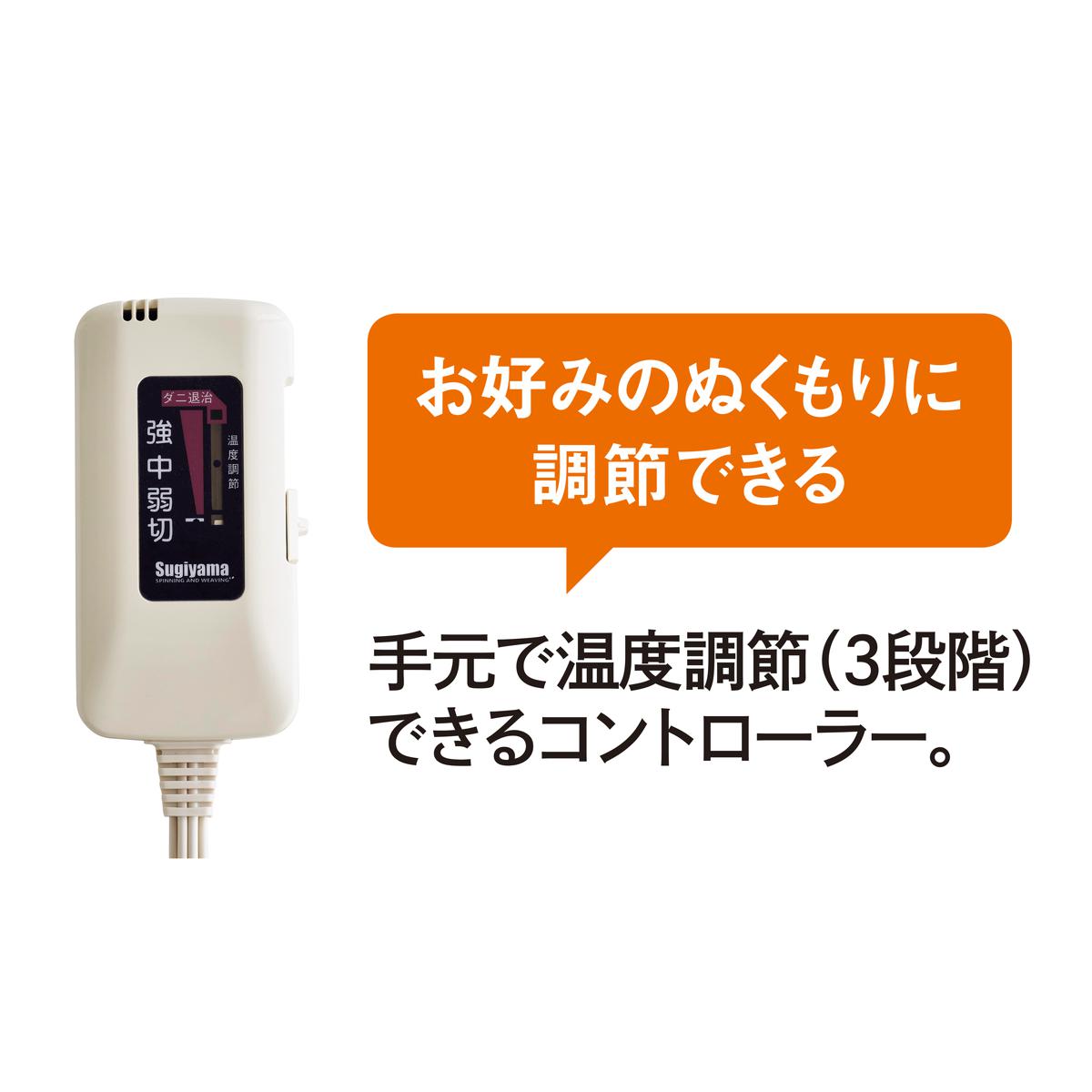 お好みのぬくもりに調節できる 手元で温度調節(3段階)できるコントローラー。