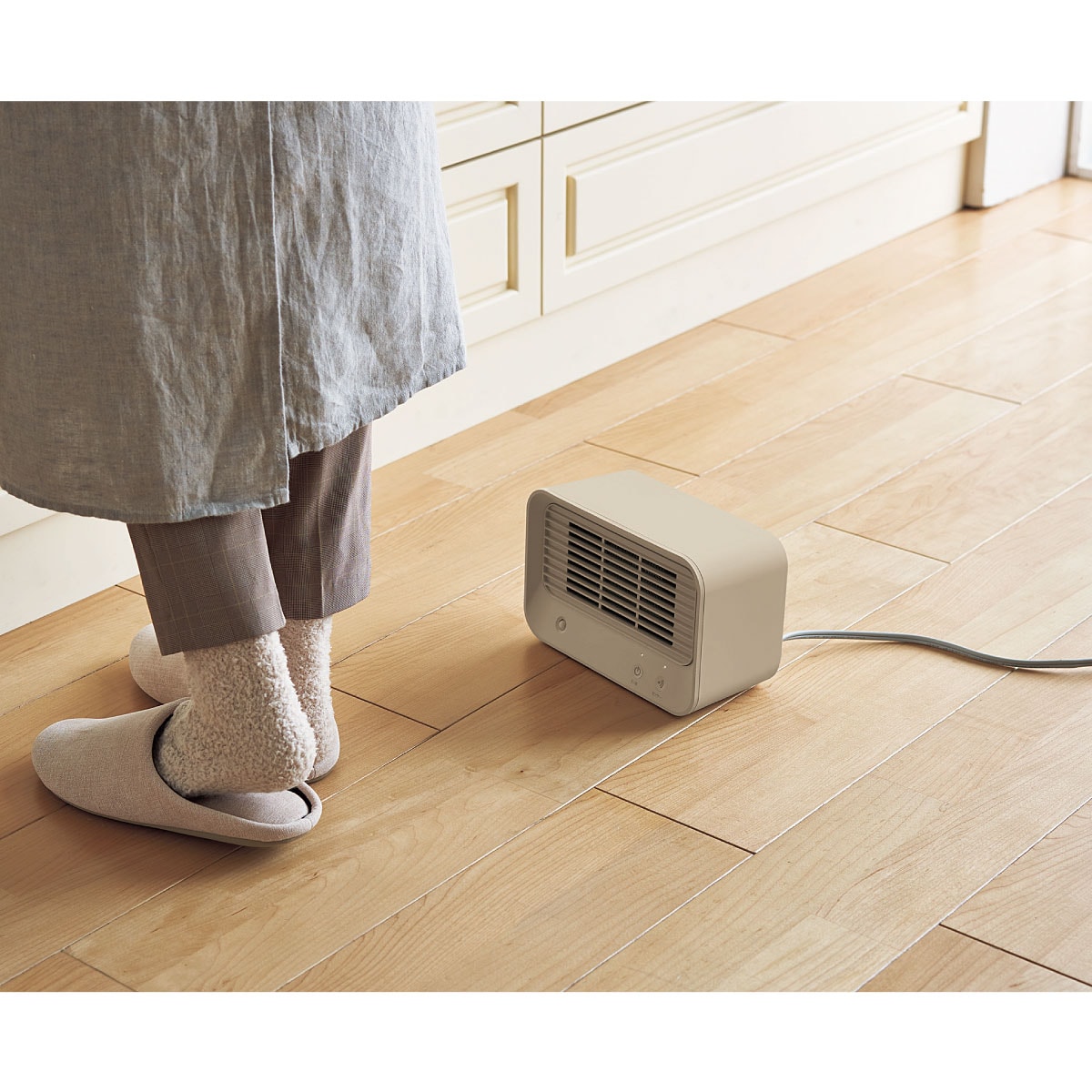キッチンの足元やデスクまわりなど、冷えが気になる場所にサッと置けるコンパクトサイズのミニセラミックヒーターです。人の動きを感知して電源が入る人感センサー付きで家計にもやさしい。トイレや脱衣所など狭い場所のヒーターとしてもおすすめです。