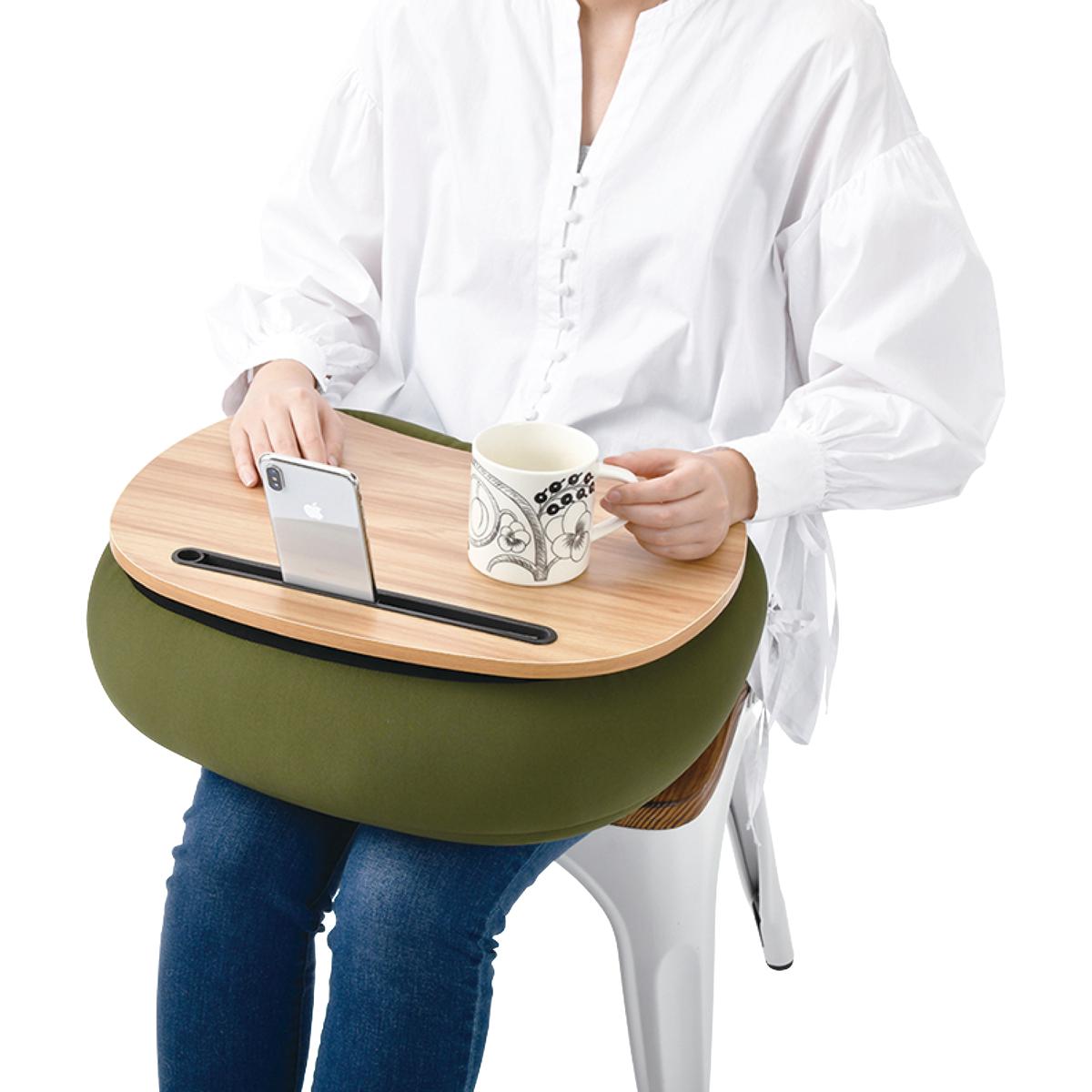 クッションに取り外し可能な天板がついた、便利なテーブルクッションです。簡単な食事をしながら一息ついたり、ちょっとした作業スペースにおすすめ。天板に溝があり、スマホやタブレットを固定できるので操作もラクラクです。テーブルを下にしてごろ寝クッションや枕としても。コンパクトなのでリビングやベッドルーム、アウトドアや車の中など様々なシーンで大活躍! インテリアにも合わせやすいカラーをご用意しました。