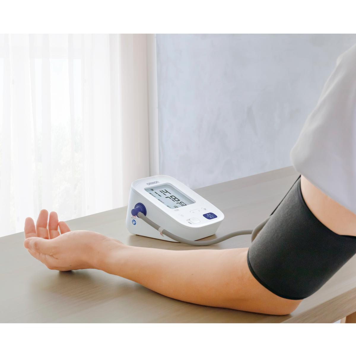 「カフぴったり巻きチェック」を搭載した上腕式の血圧計。片手で簡単に巻ける「フィットカフ」を採用しています。100回分の測定結果が2人分メモリ可能です。