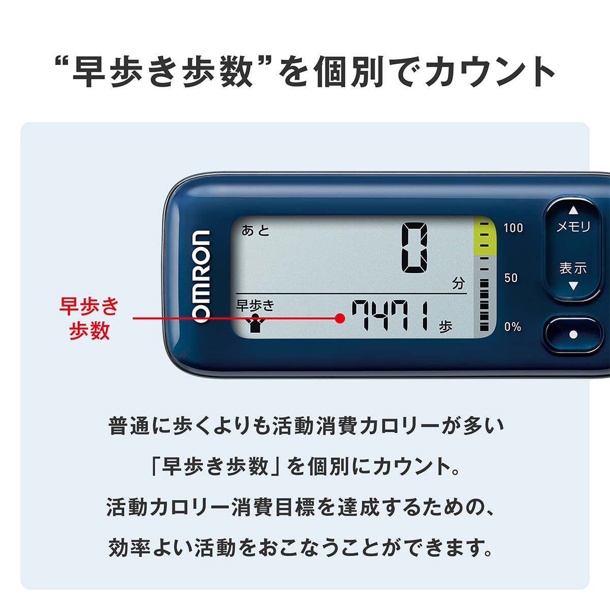 「早歩き歩数」を個別にカウントし、早歩き目標時間を表示。4週間で減らしたい体重を設定すると、目標達成に必要な1日の目標活動カロリーを自動算出。達成には早歩きであと何分かわかりやすく表示。