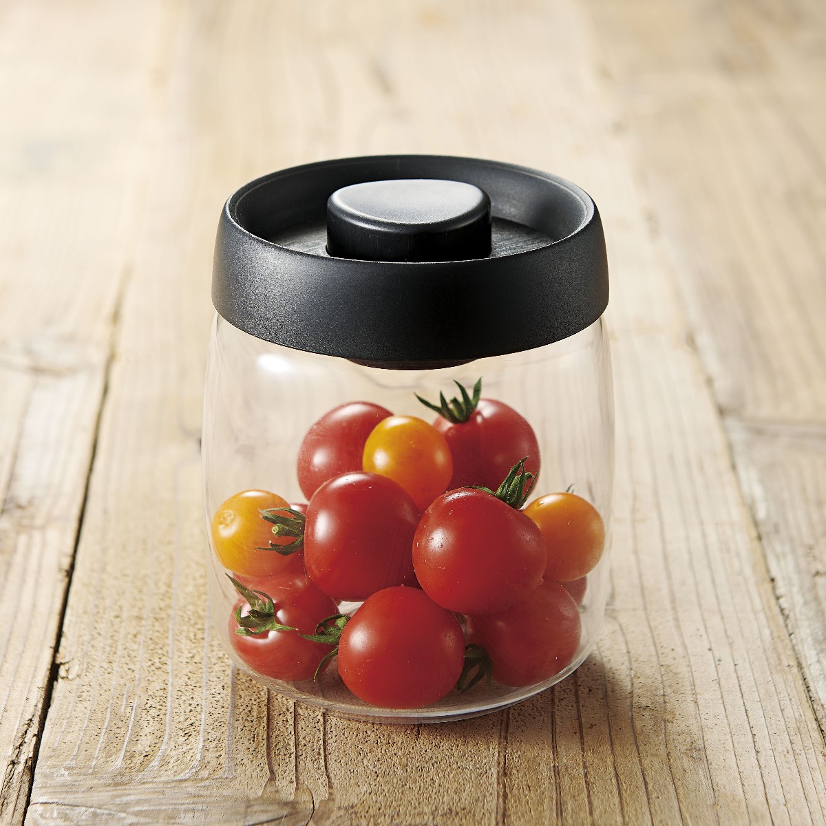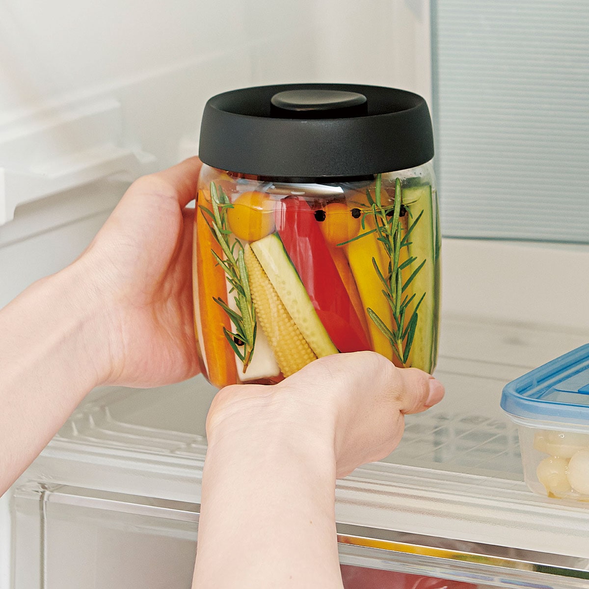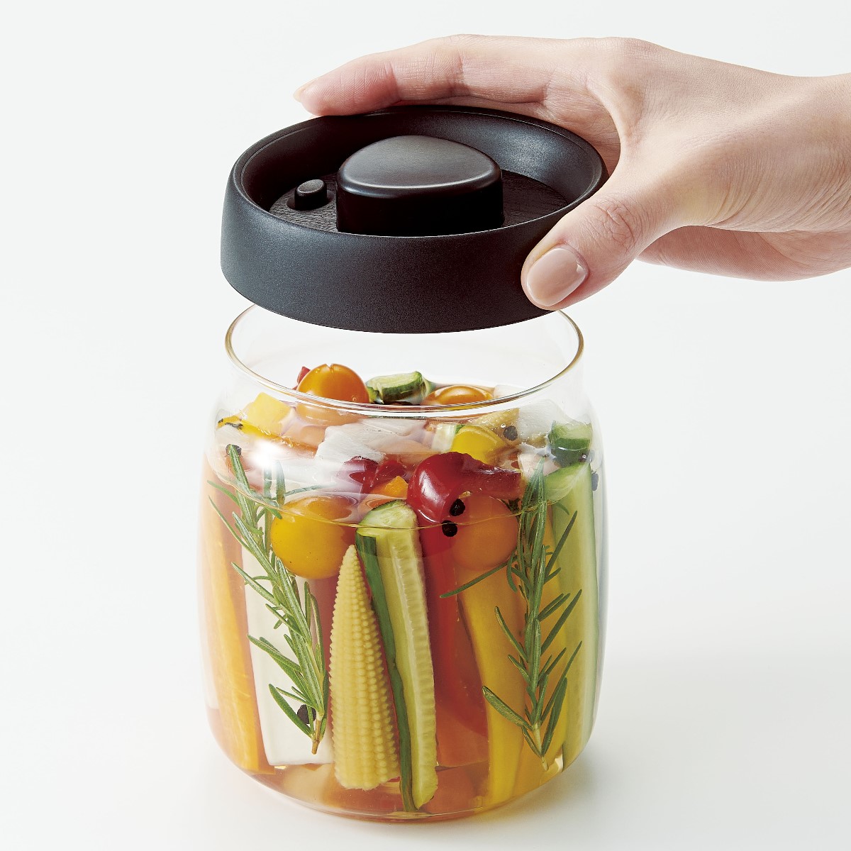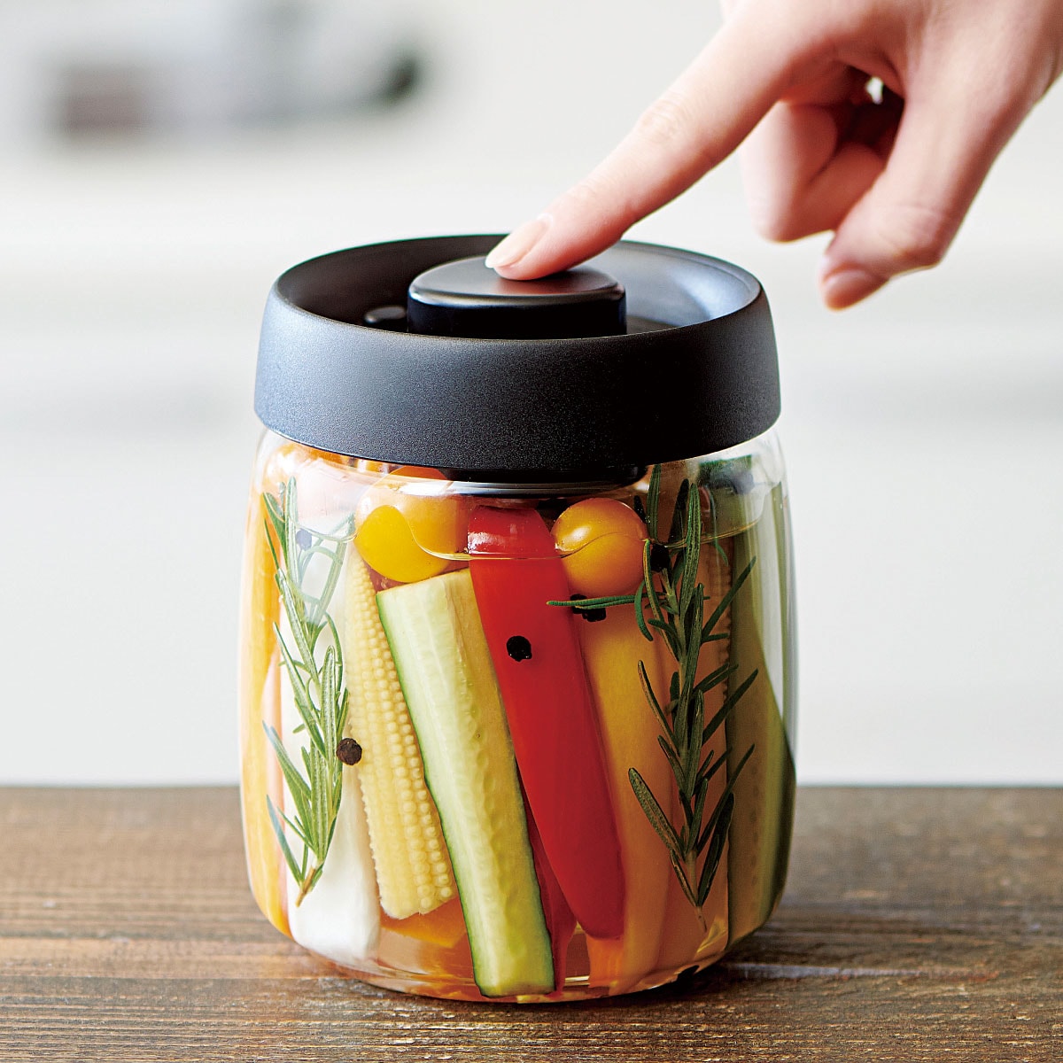 電池もポンプもいらない一体型の真空調理&保存ポット。真空にすることで味が浸透しやすく、即席浅漬けなどのスピード調理が可能に!