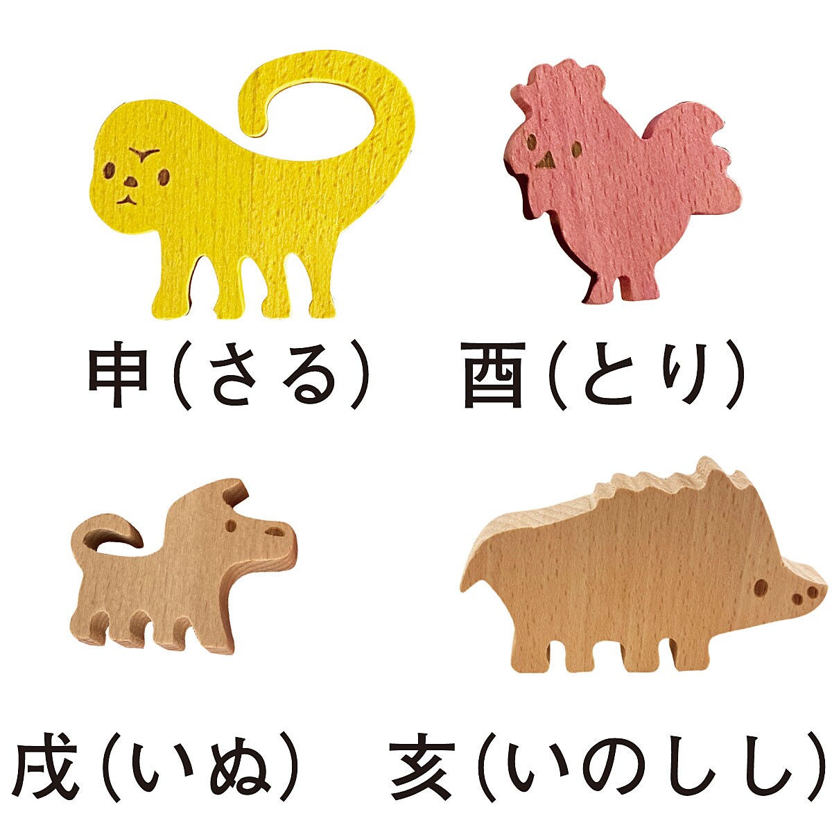 (左上から)申(さる) 酉(とり) 戌(いぬ) 亥(いのしし)