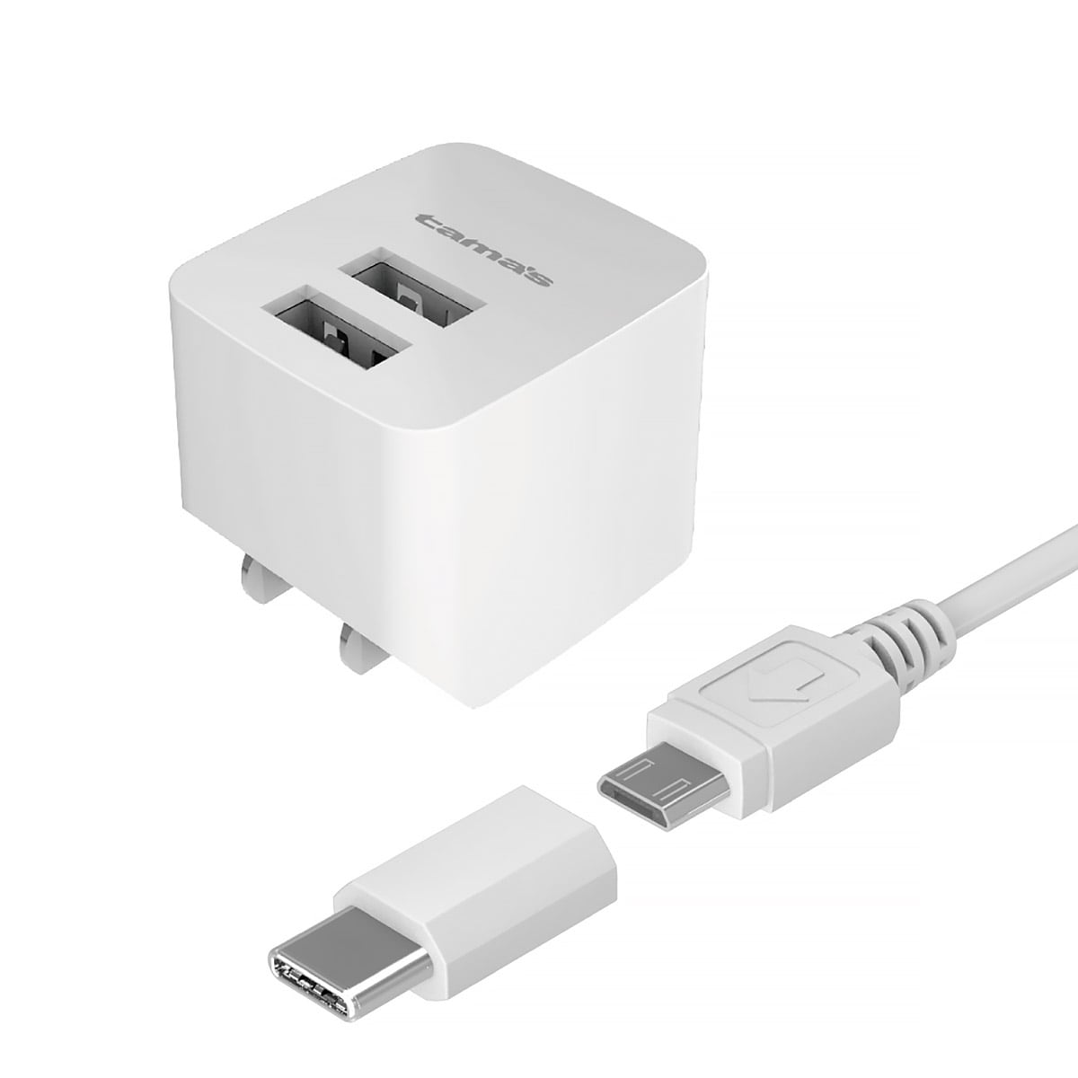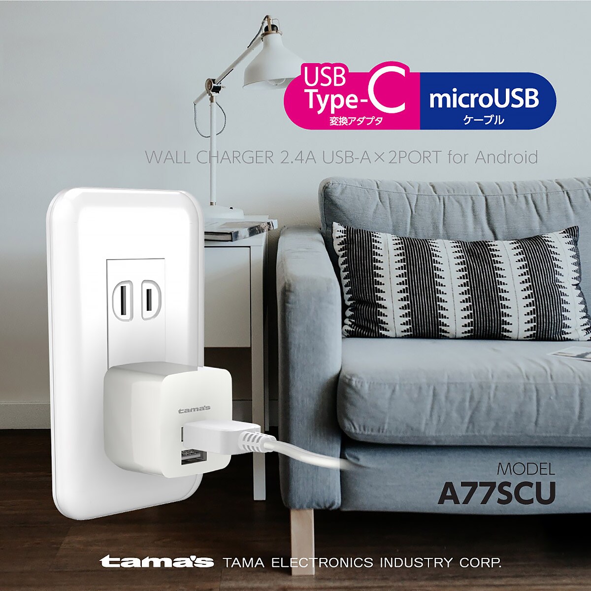 合計最大出力2.4AのマイクロUSBケーブル付属タイプのコンセント充電器。USB-Aポート付きで合計2台の機器を同時に充電可能。タイプC変換アダプタ付属でタイプCスマートフォンにも対応しております。USB-Aポートに接続した機器をICが自動で見分けて最適な電流で充電を行なうスマートパワーセレクトシリーズ。コンセントプラグは90°回転式です。海外でも使用できるAC100V240V対応。※国や地域によって市販の変換プラグが必要になる場合があります。