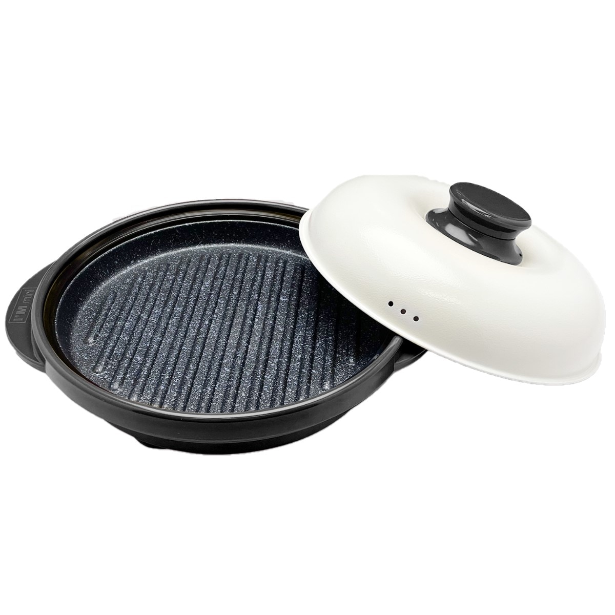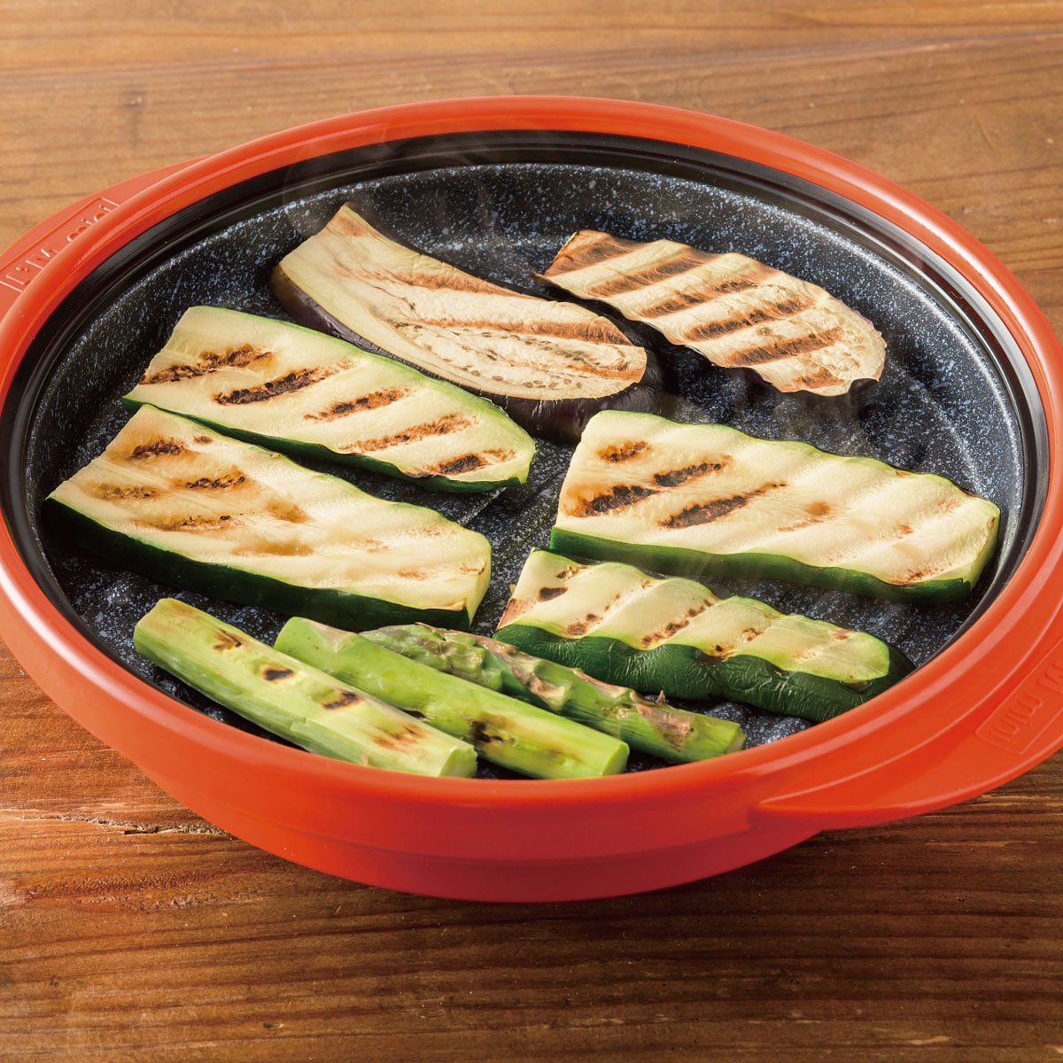 独自構造のフタが電子レンジからのマイクロ派を遮断。食材の水分構造を極力壊さず、本体内部のプレートだけが発熱し、まるでフライパンで焼いたような焦げ目を付けます。