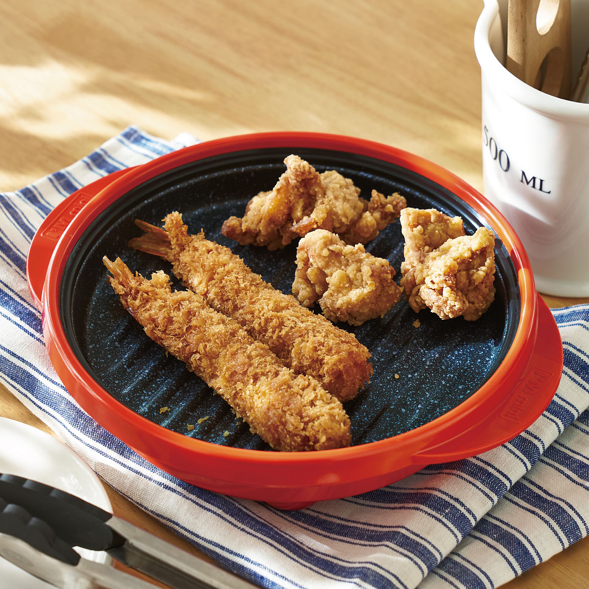 独自構造のフタが電子レンジからのマイクロ派を遮断。食材の水分構造を極力壊さず、本体内部のプレートだけが発熱し、まるでフライパンで焼いたような焦げ目を付けます。フタ付きなので油はねせず、レンジを汚さず時短調理にも。内側はふっ素樹脂加工。使用後は丸ごと洗え、お手入れ簡単。