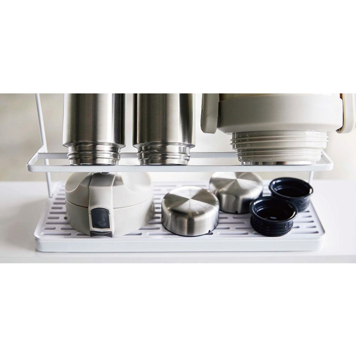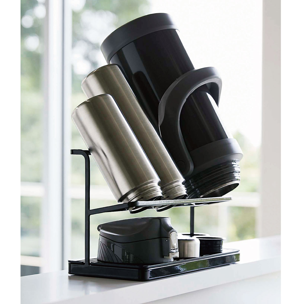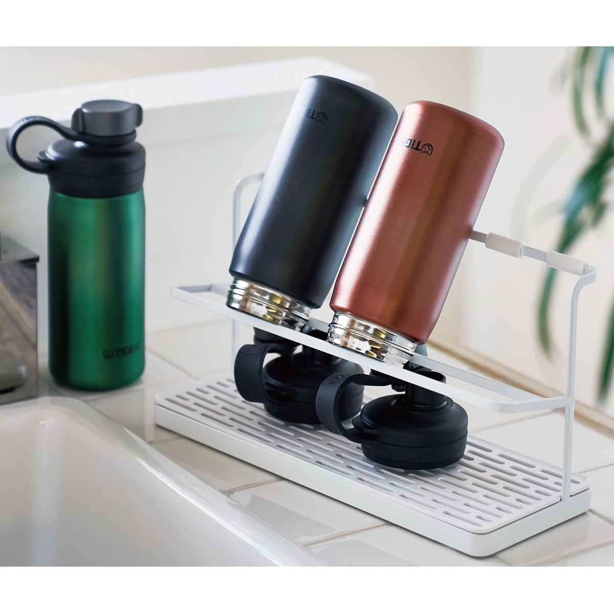 大きめのジャグボトルから小ぶりなマグボトルまで、立てかけるだけで上手に干せる専用のスタンド。水切りトレーは取り外して洗えます。