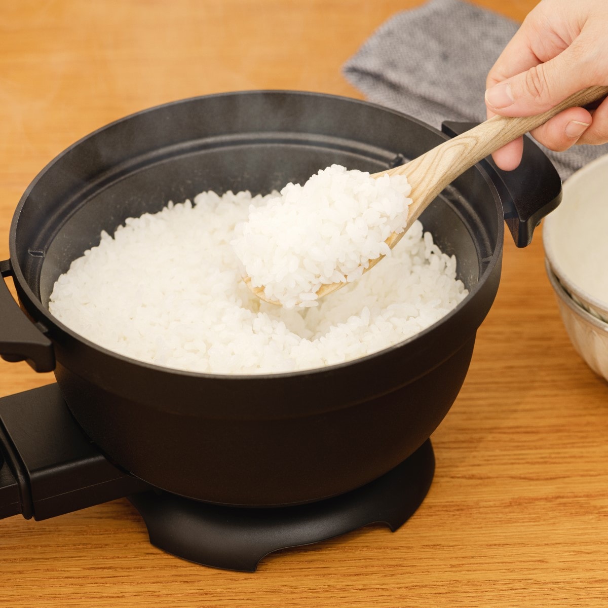 鍋フチが高く、吹きこぼれしにくい形状です。炊飯は2合までOK。まるで土鍋で炊いたかのように、お米がふっくら粒立ちます。
