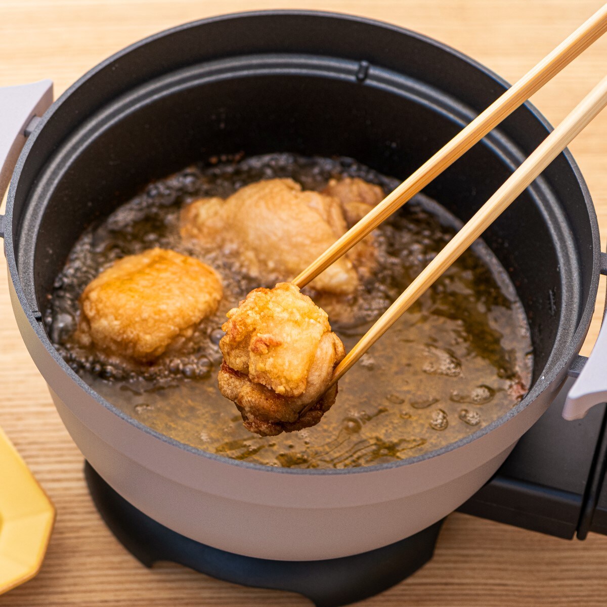鍋が深くて油ハネしにくく、少量の揚げ物にぴったり。揚げたてアツアツが卓上で楽しめます。