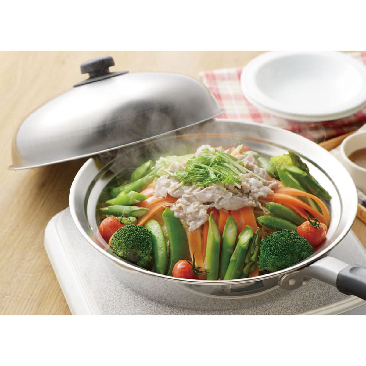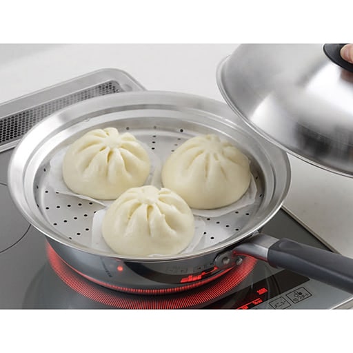 蒸ししゃぶ、中華まんやシュウマイまで!あと1品欲しいときにもうれしくなる蒸し器お手持ちのフライパンにや鍋のうえに置いて、気軽に蒸し料理が楽しめます