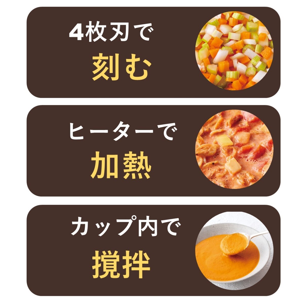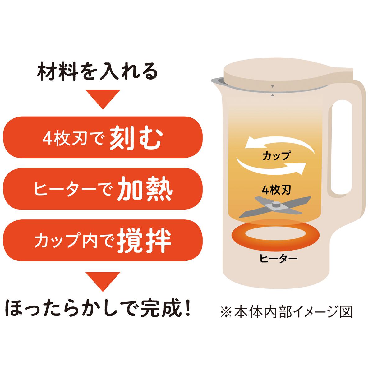 刻む・加熱・攪拌を自動で行ってくれる調理ポット。食材を刻む、鍋をかき混ぜて加熱温度を調節するなど、調理のちょっと面倒な部分を引き受けてくれるので、コンロも鍋もヘラも不要!スープ以外にこんなものも作れちゃう!