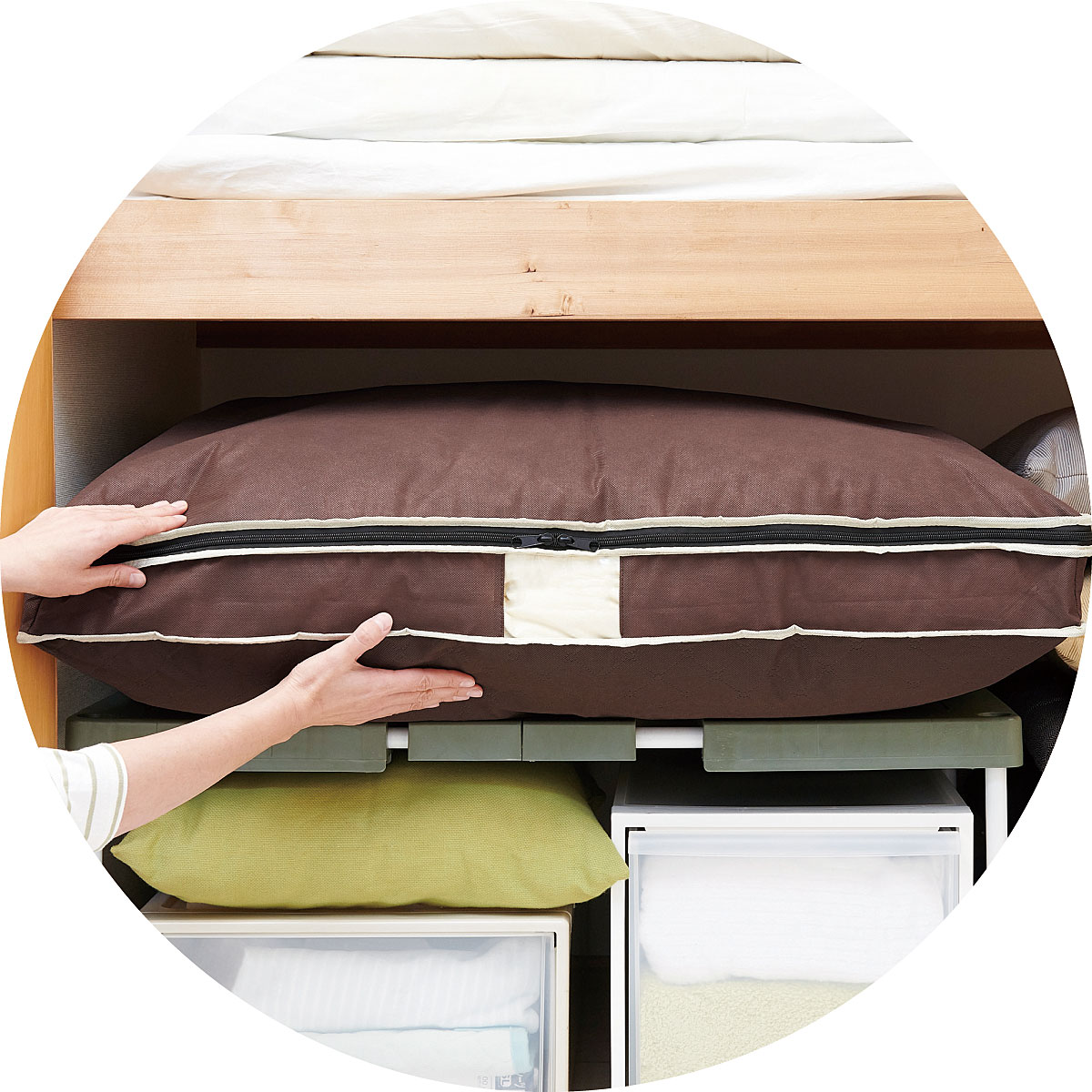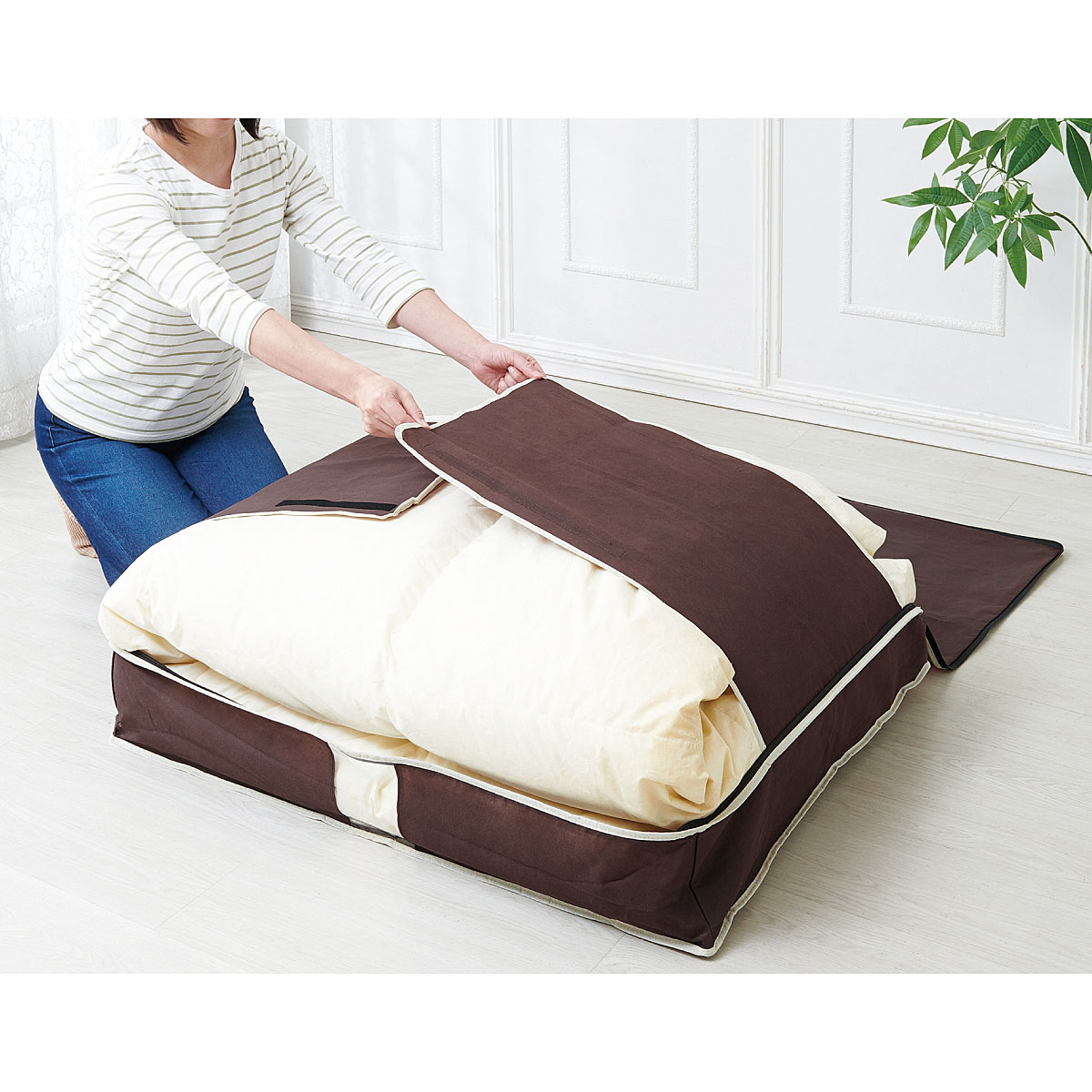 ボリュームのある羽毛布団もひとりで楽に収納。スリムに収納できるから、押入れのすき間にぴったり収まります。さらに、炭加工シートを挟んだ不織布を使用したことにより消臭効果もプラス。気になる汗のニオイや加齢臭を消臭してくれるので、大切な寝具の保管も安心です。