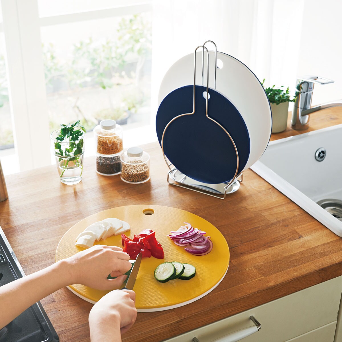 刻んだ食材をのせたまま、まな板を回していろいろな食材を一度に切ることができるのも、丸い形だからこそ。