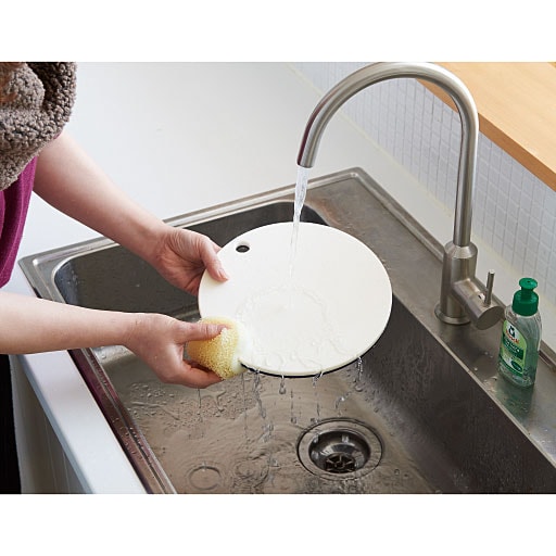 料理家 栗原はるみが中華料理のシェフが使うような丸いまな板に憧れて作った、発売以来ベストセラー商品の「丸まな板」。なんといっても、その丸い形が特徴的で、奥行きのある広い面は切ったものが落ちにくく、適度な重みもあるため、安定感があります。青ねぎなど香味野菜のみじん切りも周囲にこぼれ落ちにくく、ゆったり切ることができるのがうれしいポイント。刻んだ食材をのせたまま、まな板を回していろいろな食材を一度に切ることができるのも、丸い形だからこそ。別の器に移し替える必要がないので、洗いものも少なく済みます。