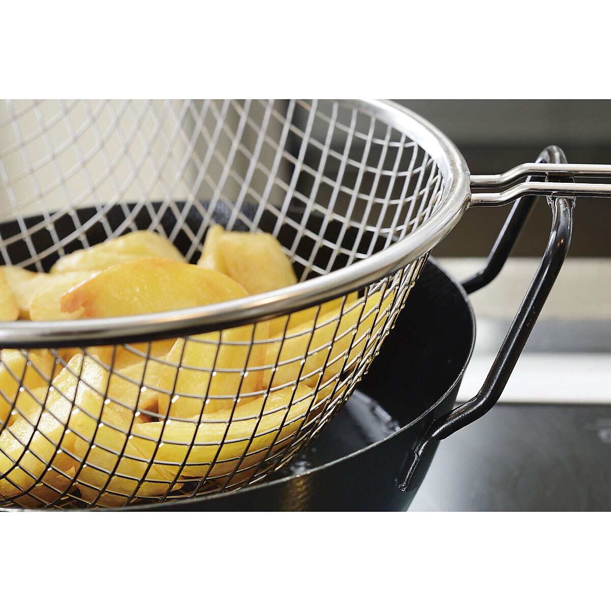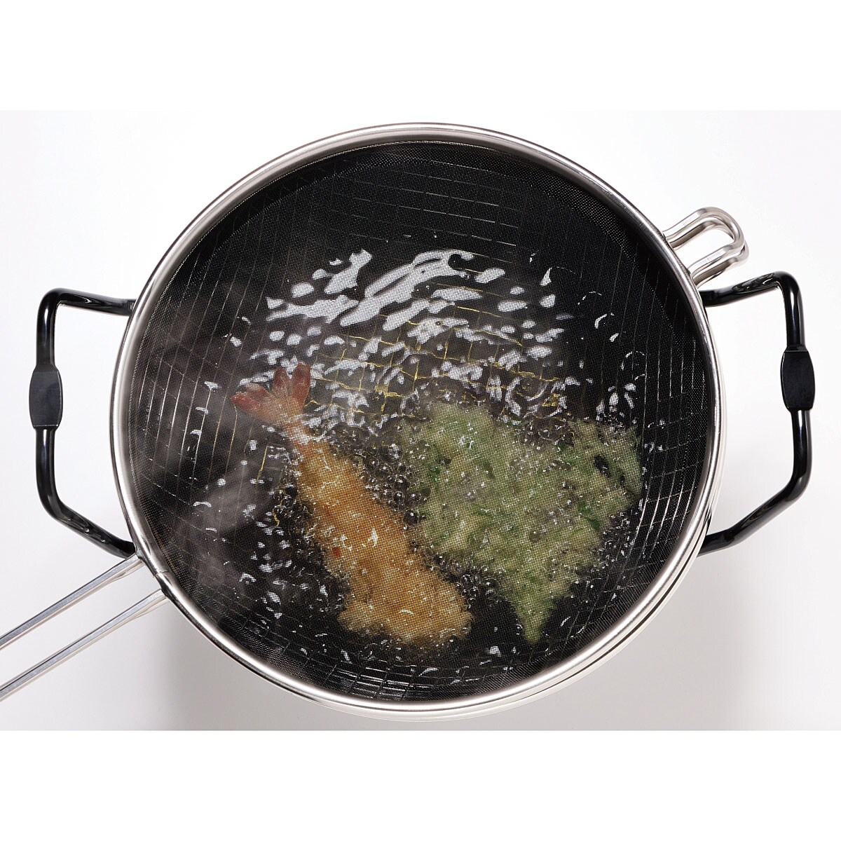 一気に引き上げられる揚げかご。鍋の取っ手に乗せて油切りもでき、二度揚げも簡単です。