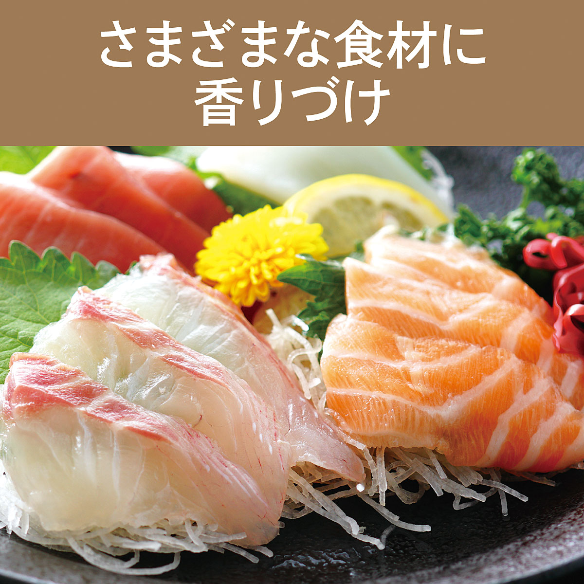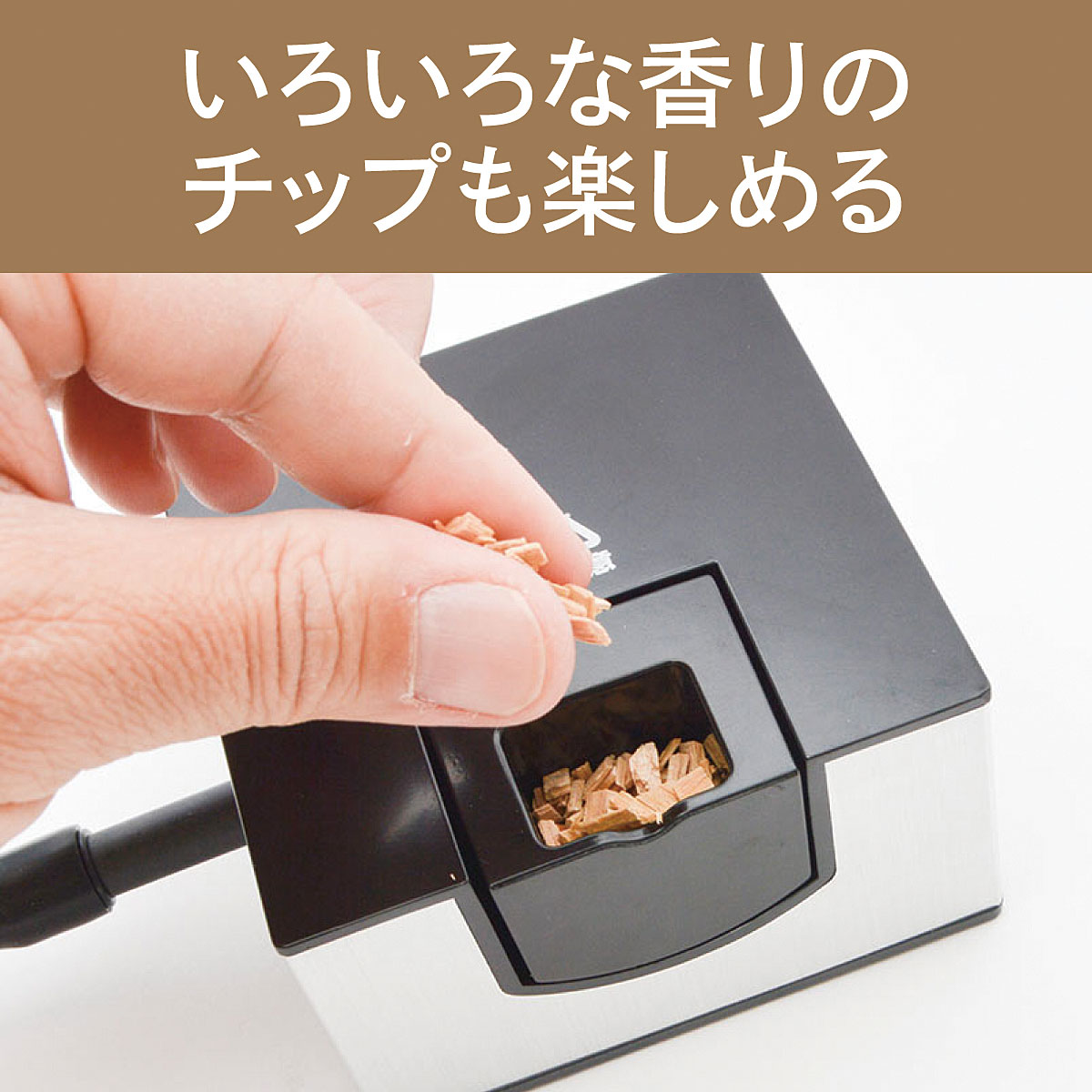 5分で完成! 手間なし。食べたいと思った時にすぐに作れ、手軽に燻製の香りを楽しめます。普通の燻製法ではできないサラダやお刺身、飲み物などにも香りづけが可能です。スモークに使用するチップは少量でOK! ケースが取り外せるので、チップの取り換えが簡単!