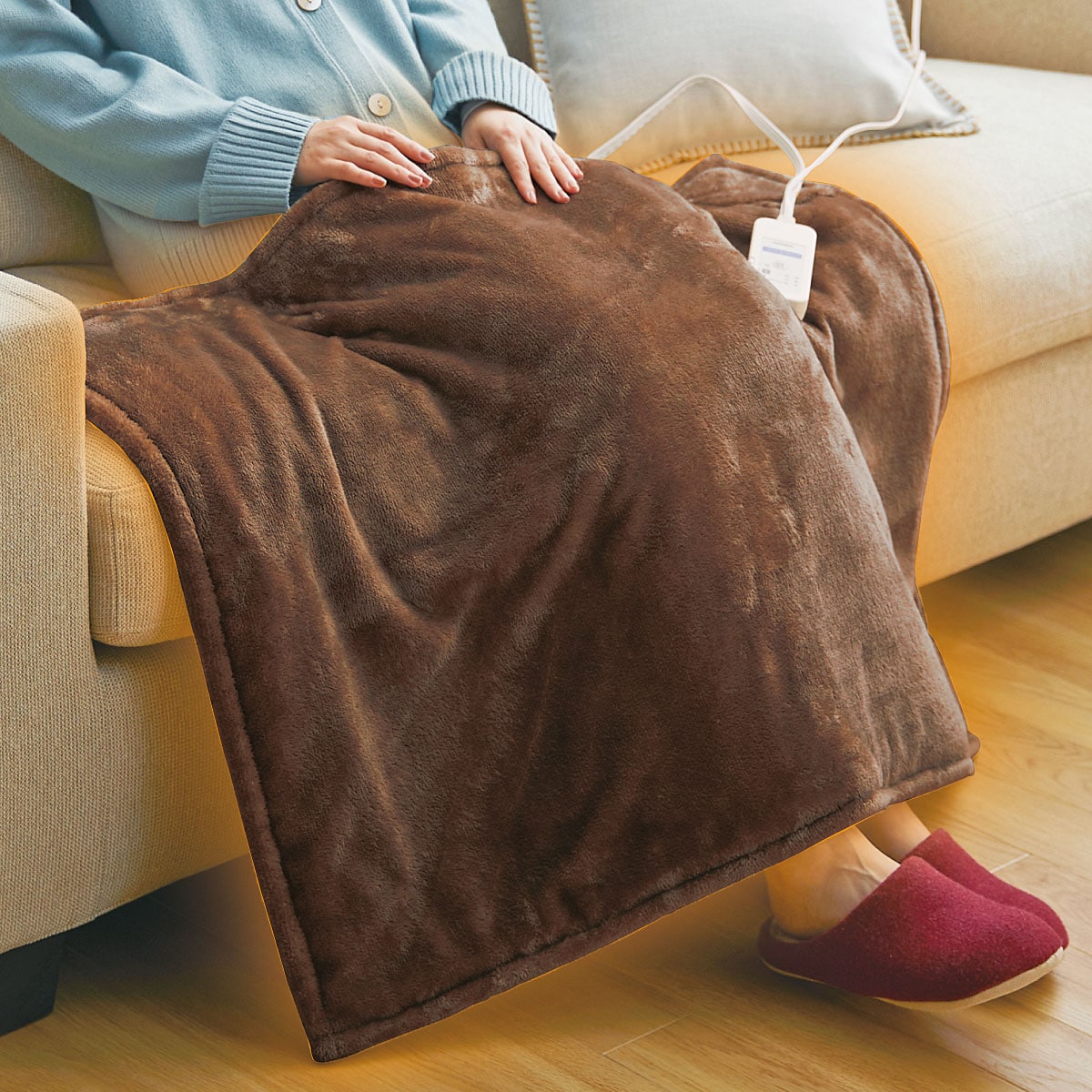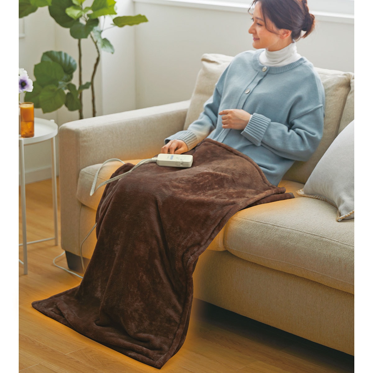 すっぽり下半身を包み込む袋型になった電気毛布! リビングでひとりのリラックスタイムに!