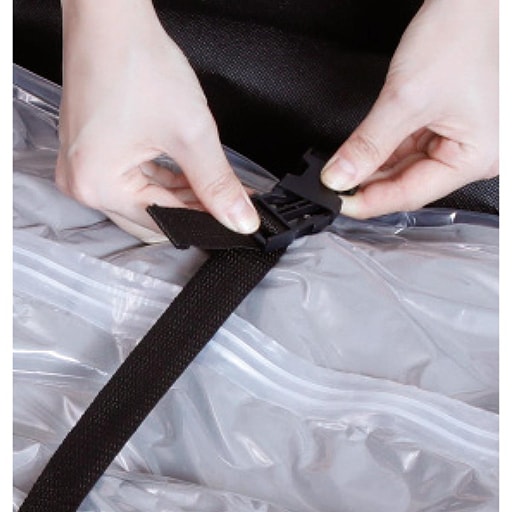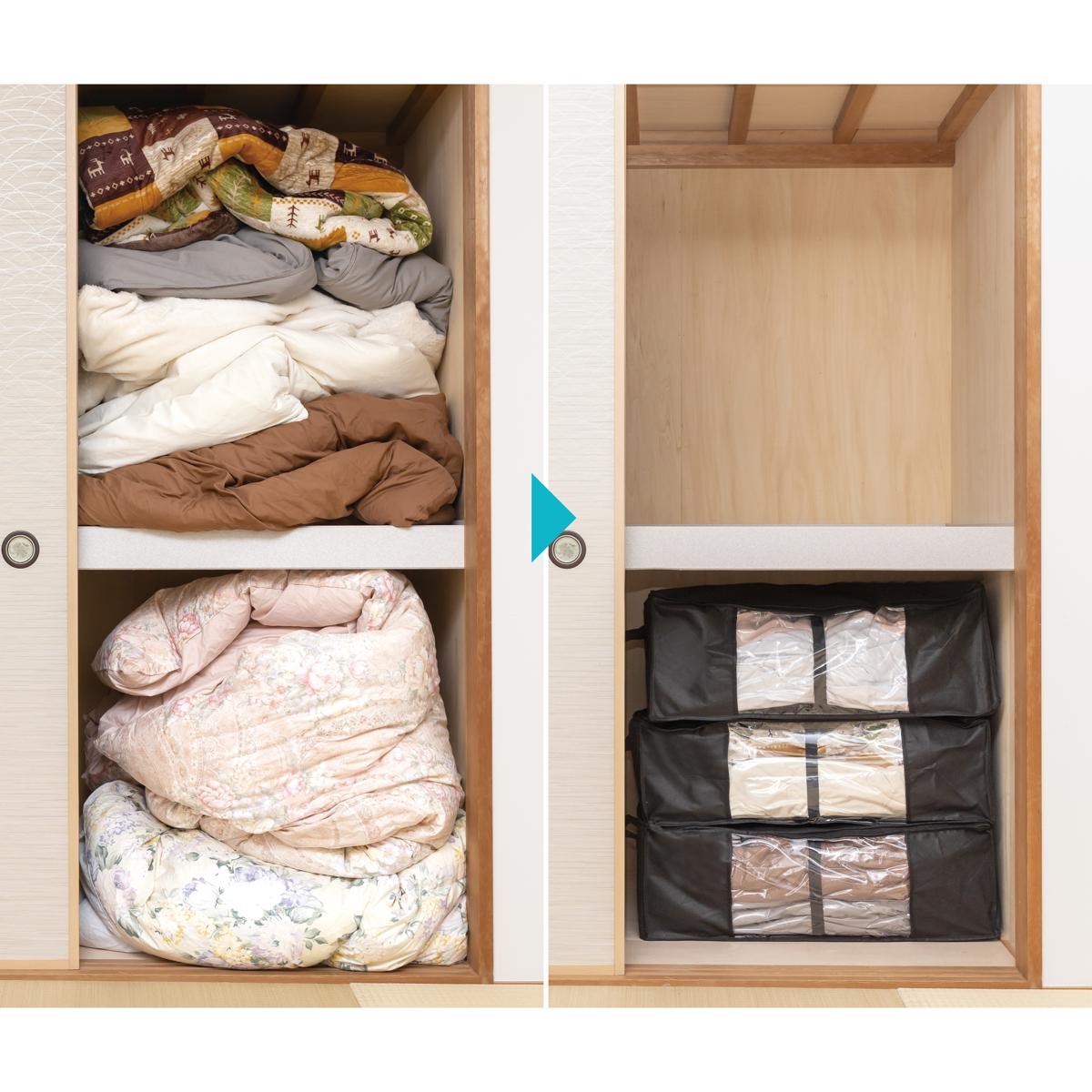 シーズンオフのかさばる布団類は圧縮袋付きの収納ケースイン。ふくらみを抑えるベルト付き。ケースの底にある面テープで圧縮袋を固定。ケースは縦にも置けるので場所をとらず、使わない時はスリムに折りたためます。