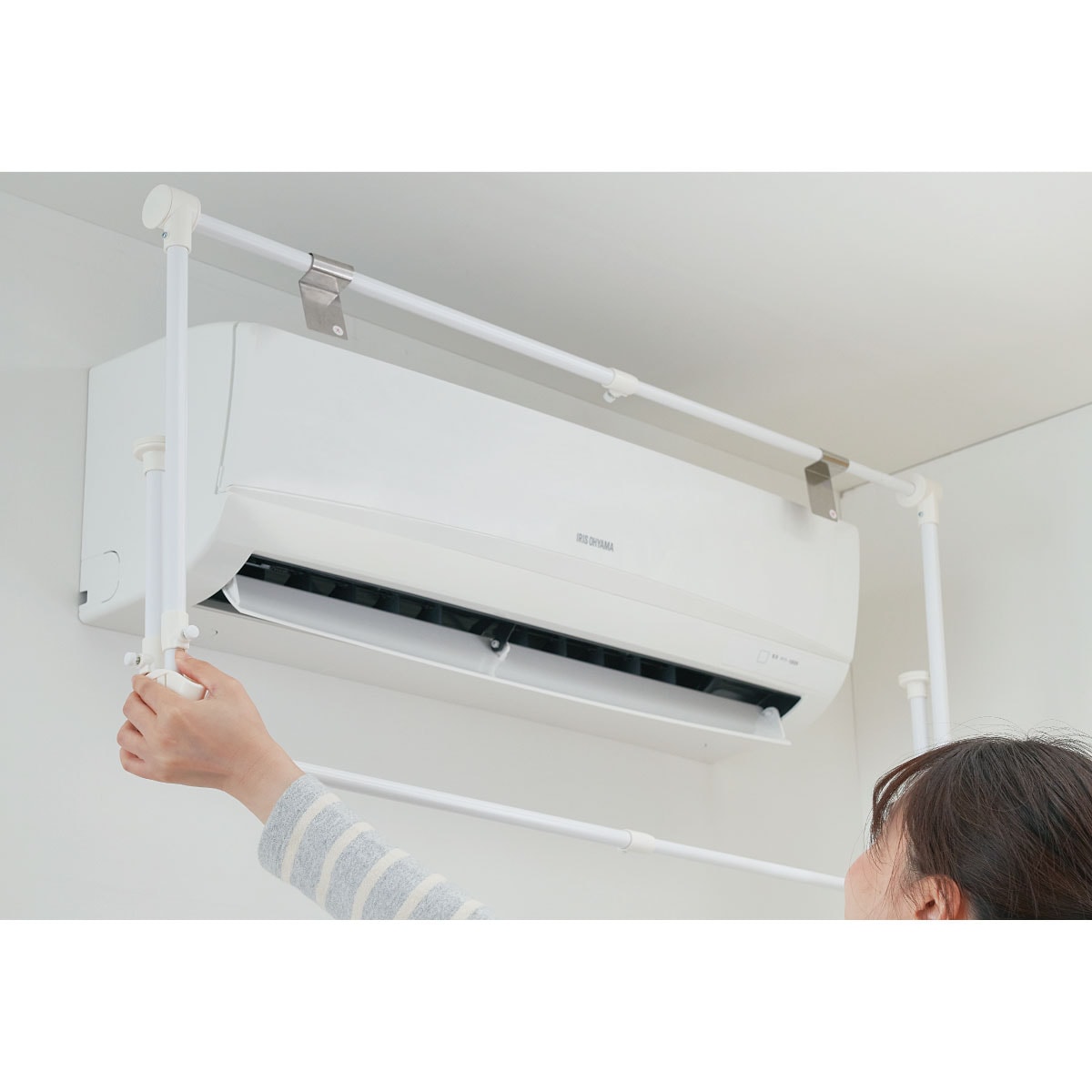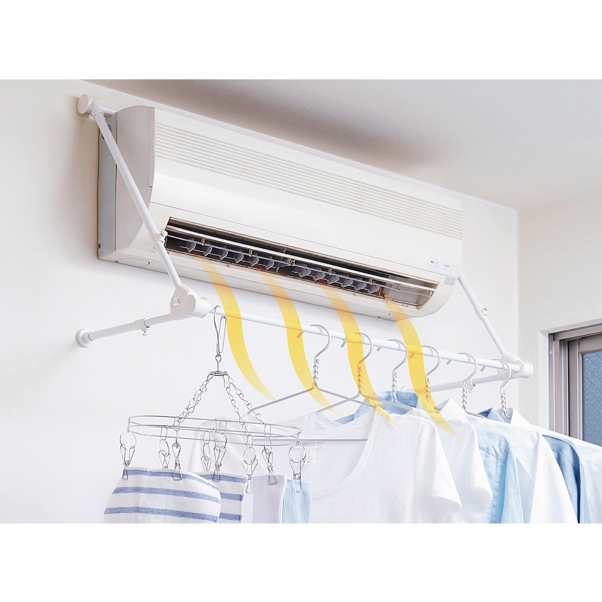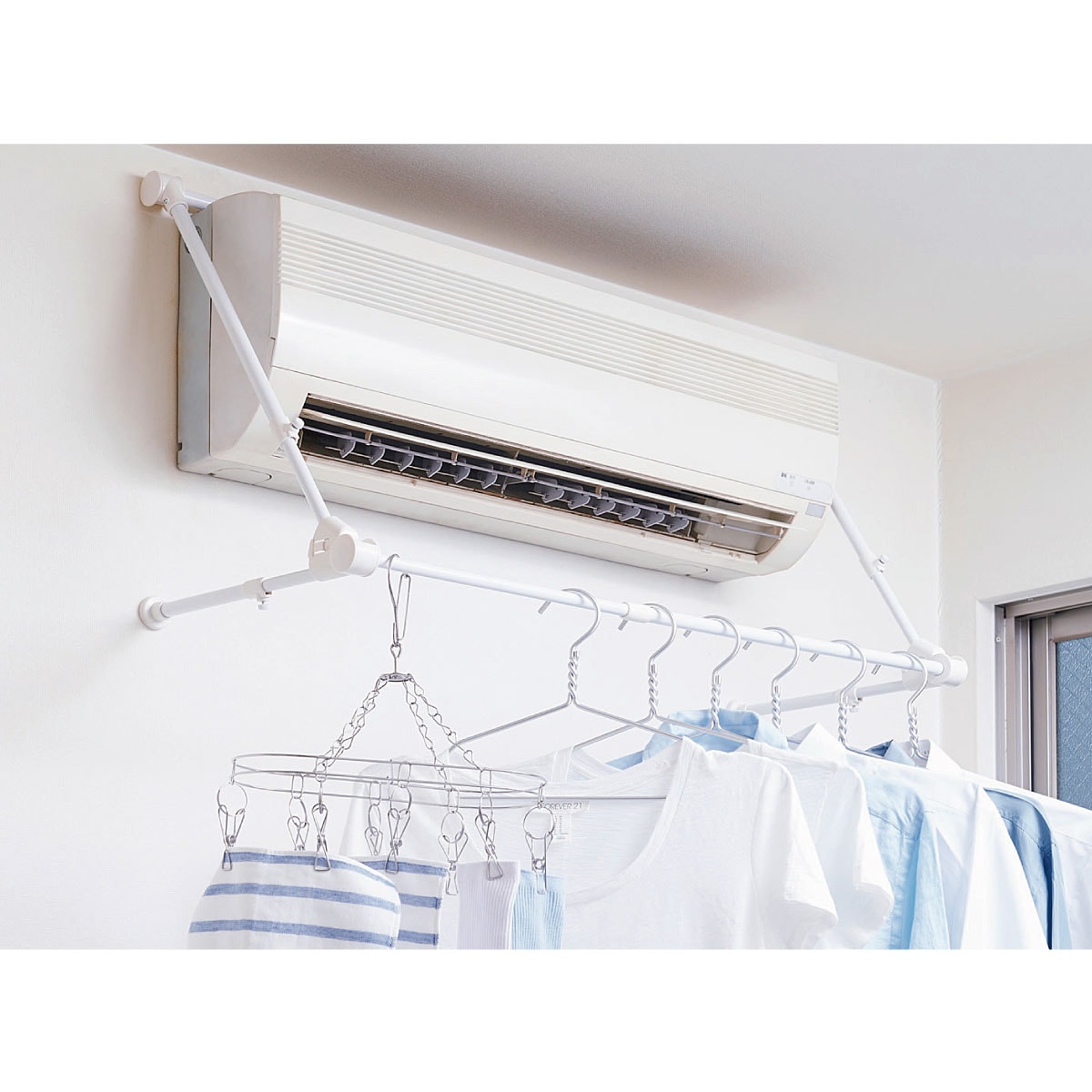 エアコンに引っ掛けるだけの簡単取り付けで、雨や花粉から守りながら洗濯物をすばやく乾燥。使わない時はすっきりと折りたためます。