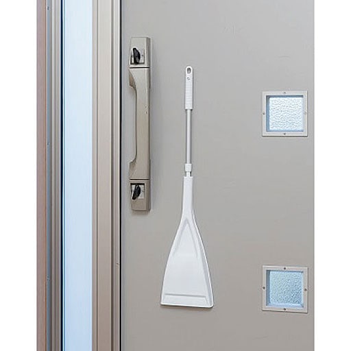 ドアに磁石でピタッとくっつき、玄関用ほうきをスマートに収納。柄の長さは伸縮可能。コシのある穂先でしっかりと掃きとれます。履きやすい角度ですみずみまですっきり。柄を外してハンディタイプでも使えます。