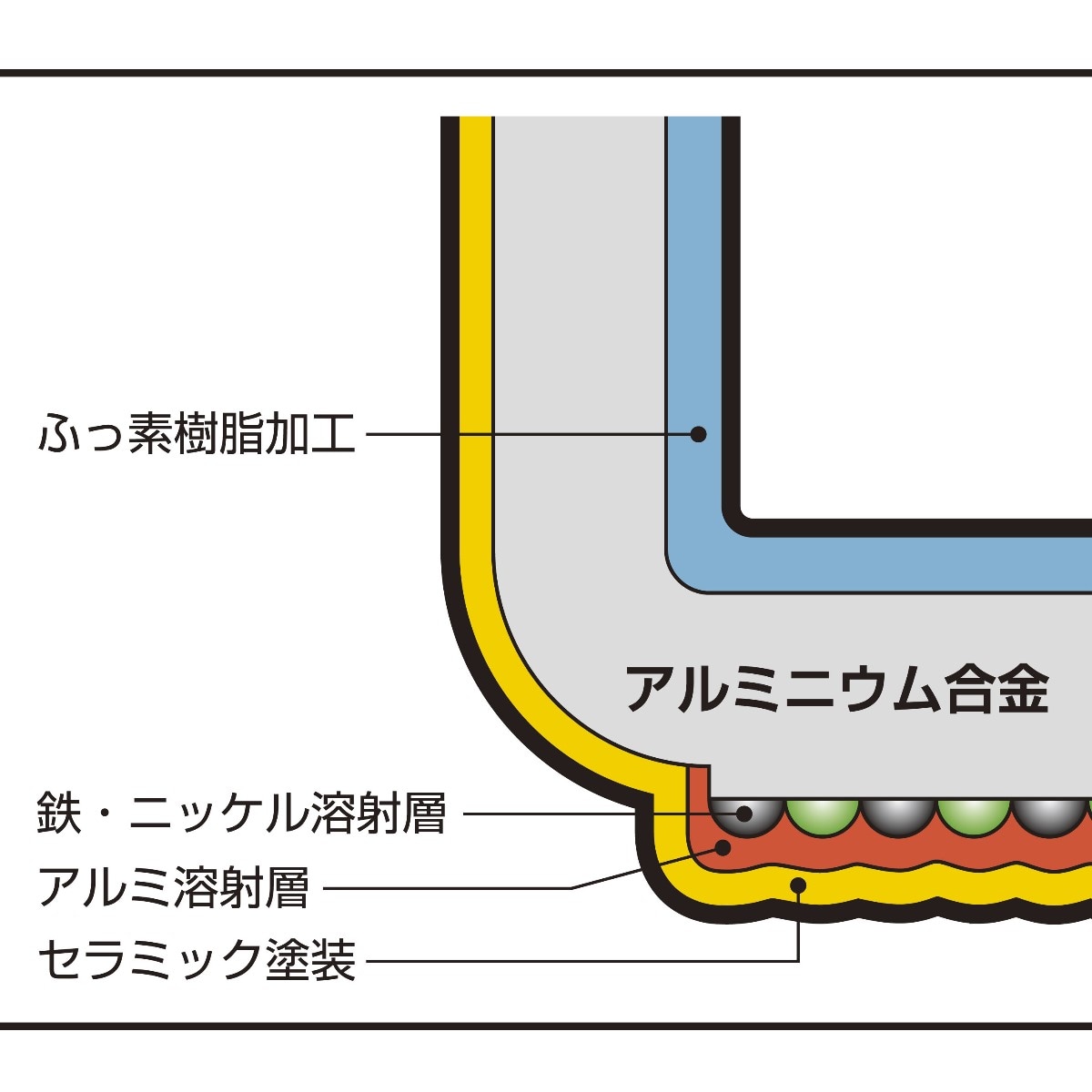 固いセラミック加工をする事により従来よりもキズが付きにくく、汚れも落としやすくなりました。ガスコンロはもちろん電磁調理器IH200V対応しています。