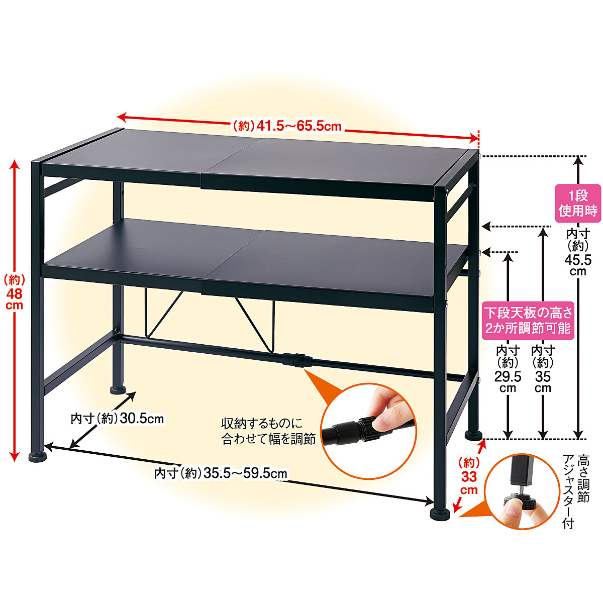 ■[本体]スチール(粉体塗装) ■サイズ(約cm)/幅41.5~65.5×奥行き33×高さ48 ■耐荷重(約)/[上段]10kg [下段]2kg[フック(1本)]500g ■セット内容/サイドフレーム×2(アジャスター付)、背面フレーム×1、天板上×2、天板下×2、スライドポール×2、ネジ×12、フック×3、六角レンチ×1、組立説明書●中国製